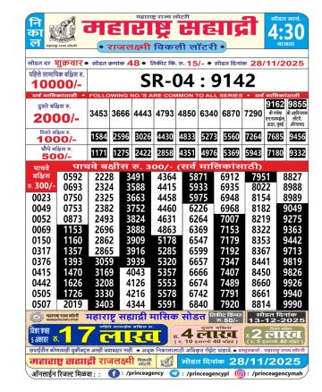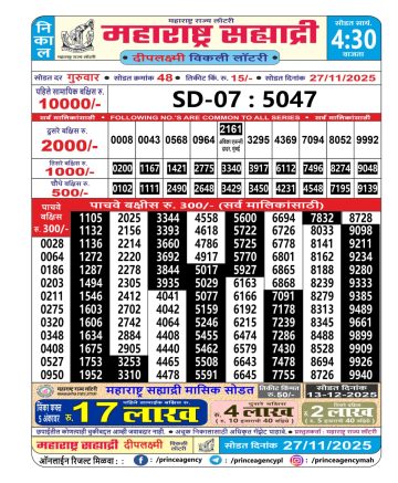 • Maharashtra Sagar Laxmi weekly lottery result 01/12/2025