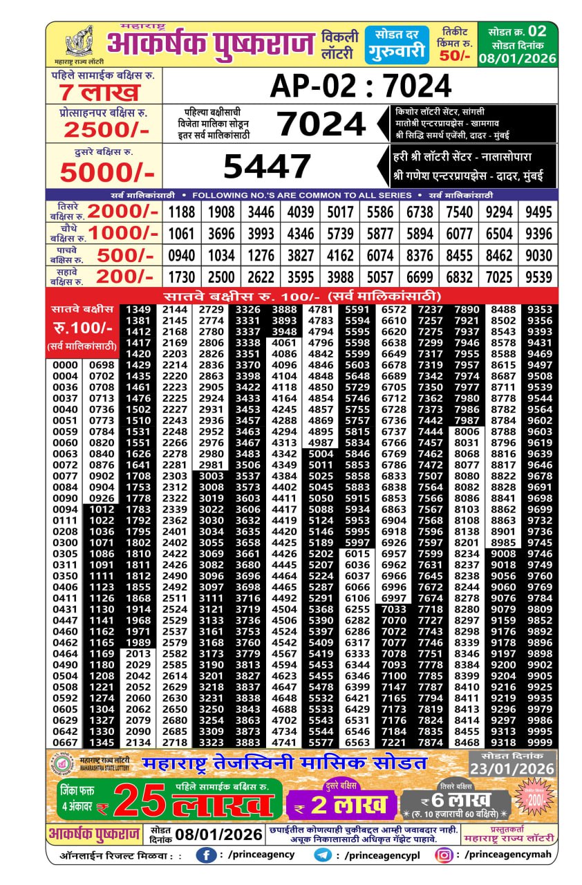 Maharashtra Akarshak Weekly Lottery Result 08/01/26 08/01/26 Leave a Comment on Maharashtra Akarshak Weekly Lottery Result 08/01/26 Share: XFacebookPinterestRedditVKDiggLinkedinMix Related Articles 0 127 Maharashtra Laxmi Weekly Lottery Result 02/08/25 0 124 Maharashtra Padmini weekly lottery result 29/07/25 0 109 Maharashtra Akshay Weekly Lottery Result 02/07/25 0 118 Maharashtra Sagar Laxmi weekly lottery result 22/12/2025