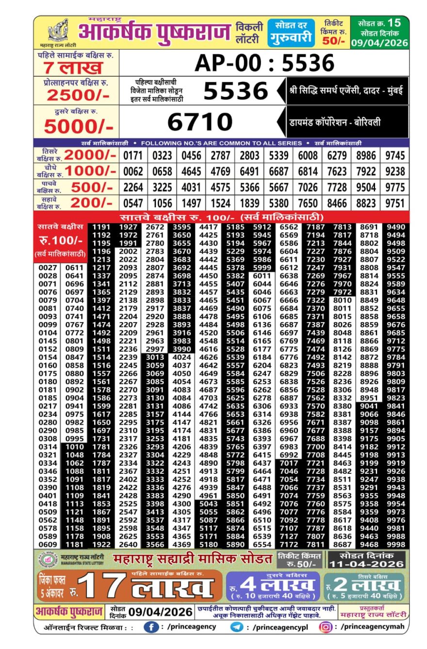 Maharashtra Akarshak Weekly Lottery Result 09/04/26 09/04/26 Leave a Comment on Maharashtra Akarshak Weekly Lottery Result 09/04/26 Share: XFacebookPinterestRedditVKDiggLinkedinMix Related Articles 0 307 Maharashtra Sagar Laxmi weekly lottery result 10/11/2025 0 226 Maharashtra Sahyadri weekly lottery result 25/4/25 0 292 Maharashtra Akarshak Weekly Lottery Result 06/11/25 0 339 Maharashtra Sagar Laxmi weekly lottery result 13/10/2025