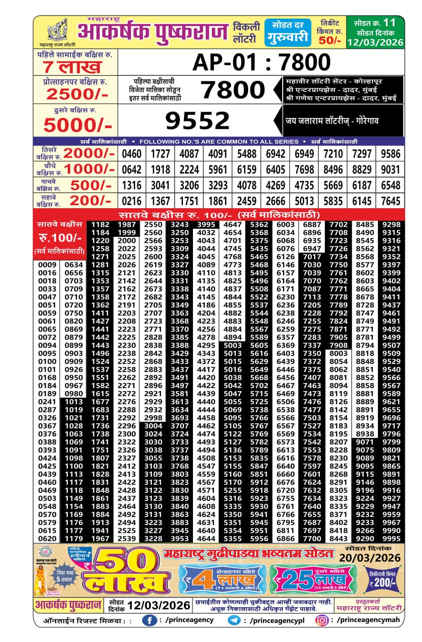 Maharashtra Akarshak Weekly Lottery Result 12/03/26 12/03/26 Leave a Comment on Maharashtra Akarshak Weekly Lottery Result 12/03/26 Share: XFacebookPinterestRedditVKDiggLinkedinMix Related Articles 0 226 Maharashtra sagarlaxmi weekly lottery result 21/4/25 0 266 Maharashtra Laxmi Weekly Lottery Result 12/07/25 0 236 Maharashtra Laxmi Weekly Lottery Result 10/01/26 0 465 Maharashtra Akarshak Weekly Lottery Result 19/03/26