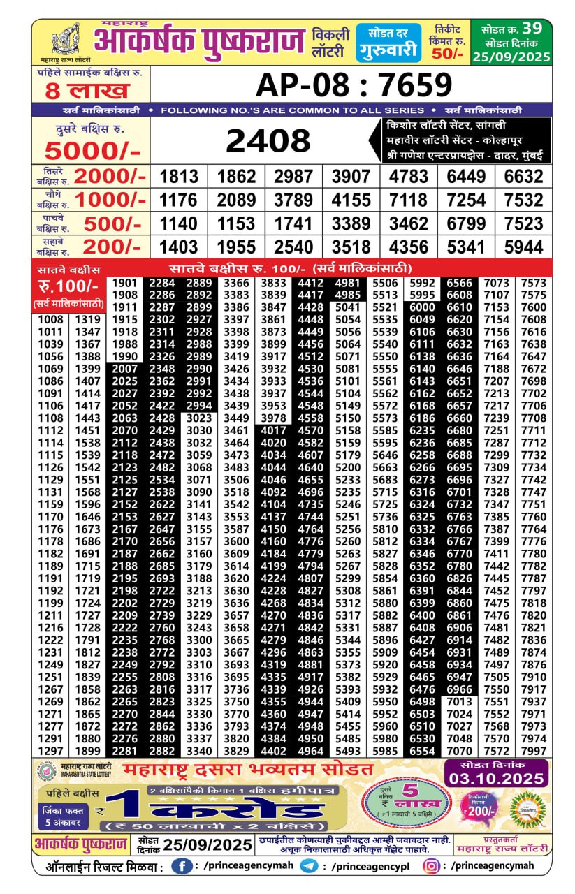 Maharashtra Akarshak Weekly Lottery Result 25/09/25 25/09/25 Leave a Comment on Maharashtra Akarshak Weekly Lottery Result 25/09/25 Share: XFacebookPinterestRedditVKDiggLinkedinMix Related Articles 0 58 Maharashtra sagarlaxmi weekly lottery result 09/06/25 0 11 Maharashtra Akshay Weekly Lottery Result 29/10/25 0 60 Maharashtra sagarlaxmi weekly lottery result 21/4/25 0 65 Maharashtra akarshak lottery result 6/3/25