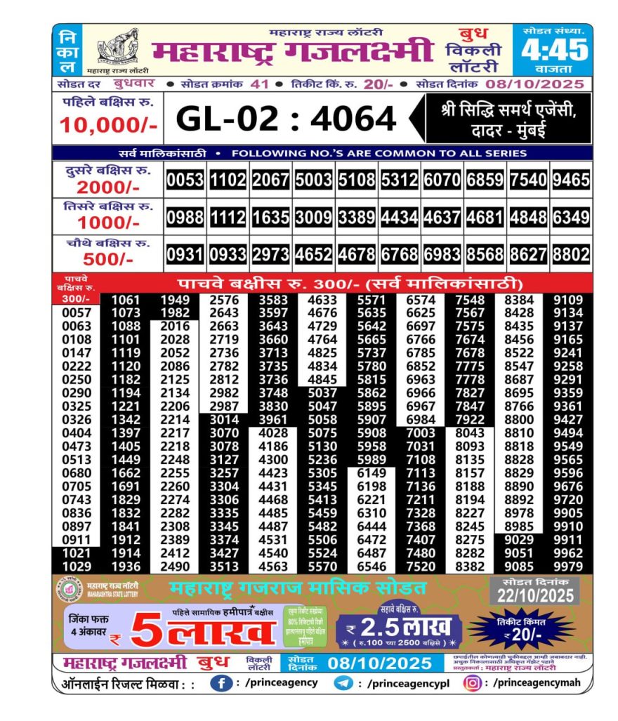 Maharashtra Gaj Laxmi Lottery Result 08/10/25 08/10/25 Leave a Comment on Maharashtra Gaj Laxmi Lottery Result 08/10/25 Share: XFacebookPinterestRedditVKDiggLinkedinMix Related Articles 0 57 Maharashtra Gajlaxmi Lottery Result 30/08/25 0 87 Maharashtra Gajlaxmi Lottery Result 31/05/25 0 38 Maharashtra Gajlaxmi Lottery Result 18/5/25 0 53 Maharashtra Gajlaxmi lottery result 27/4/25