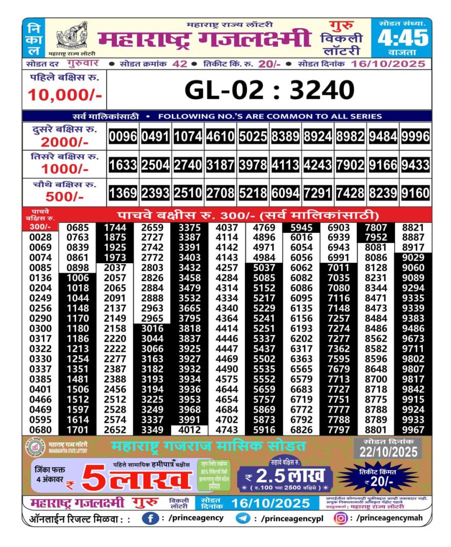Maharashtra Gaj Laxmi Lottery Result 16/10/25 16/10/25 Leave a Comment on Maharashtra Gaj Laxmi Lottery Result 16/10/25 Share: XFacebookPinterestRedditVKDiggLinkedinMix Related Articles 0 86 Maharashtra Gajlaxmi Lottery Result 06/09/25 0 56 Maharashtra Gajlaxmi Lottery Result 31/08/25 0 34 Maharashtra Gaj laxmi lottery result 7/5/25 0 42 Maharashtra Gajlaxmi lottery result 27/3/25