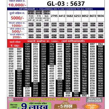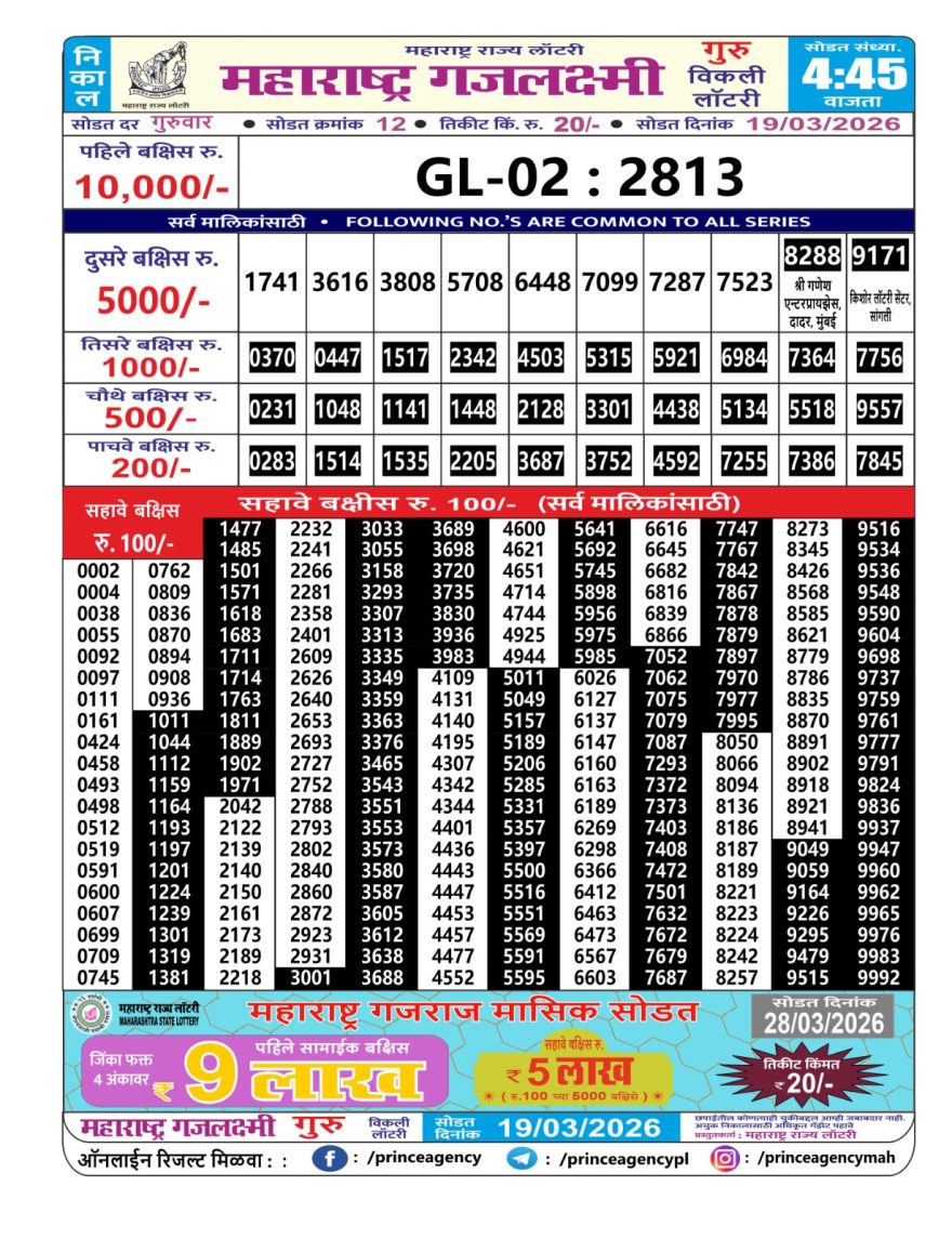 Maharashtra Gaj Laxmi Lottery Result 19/03/26 19/03/26 Leave a Comment on Maharashtra Gaj Laxmi Lottery Result 19/03/26 Share: XFacebookPinterestRedditVKDiggLinkedinMix Related Articles 0 221 Maharashtra Gajlaxmi Lottery Result 04/01/26 0 229 Maharashtra Gajlaxmi Lottery Result 17/08/25 0 208 Maharashtra Gajlaxmi Lottery Result 01/02/26 1 192 Maharashtra Gajlaxmi Lottery Result 23/06/25