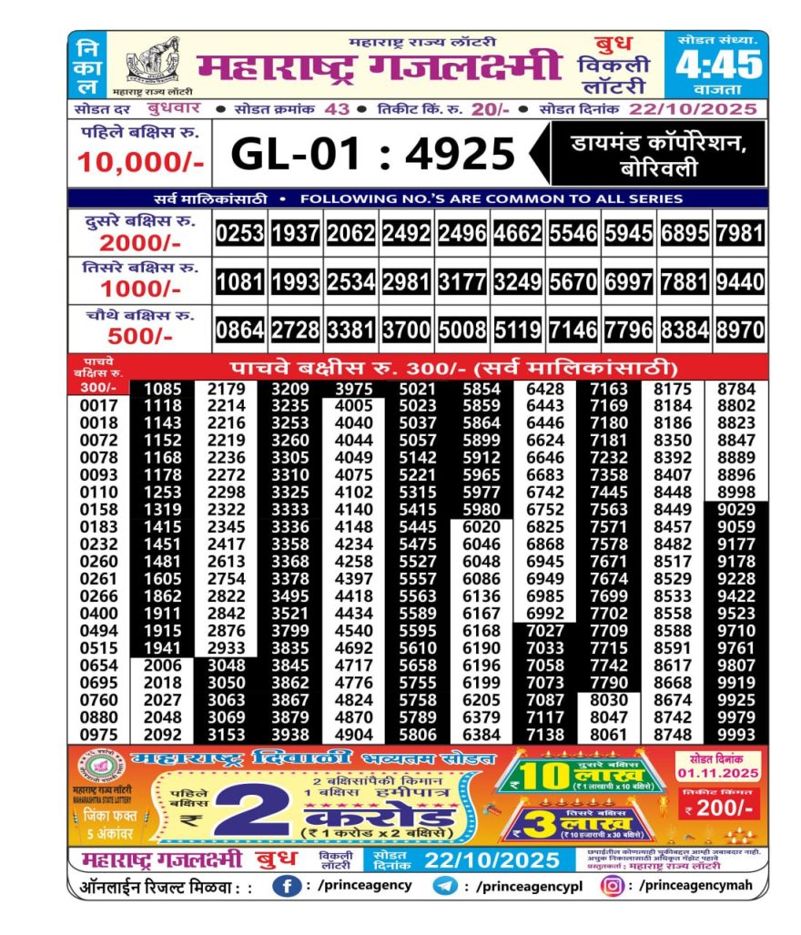 Maharashtra Gaj Laxmi Lottery Result 22/10/25 22/10/25 Leave a Comment on Maharashtra Gaj Laxmi Lottery Result 22/10/25 Share: XFacebookPinterestRedditVKDiggLinkedinMix Related Articles 0 28 Maharashtra Gaj Laxmi Lottery Result 09/07/25 0 49 Maharashtra Gajlaxmi lottery result 3/5/25 0 42 Maharashtra Gaj laxmi lottery result 23/4/25 0 36 Maharashtra Gajlaxmi Lottery Result 14/07/25