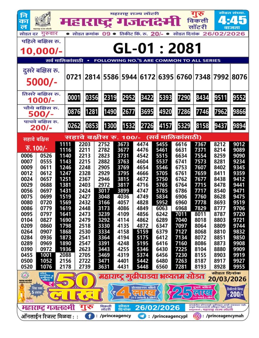 Maharashtra Gaj Laxmi Lottery Result 26/02/26 26/02/26 Leave a Comment on Maharashtra Gaj Laxmi Lottery Result 26/02/26 Share: XFacebookPinterestRedditVKDiggLinkedinMix Related Articles 0 131 Maharashtra Gajlaxmi Lottery Result 30/06/25 0 106 Maharashtra Gaj Laxmi Lottery Result 09/07/25 0 123 Maharashtra Gajlaxmi Lottery Result 11/07/25 0 141 Maharashtra Gajlaxmi Lottery Result 09/06/25