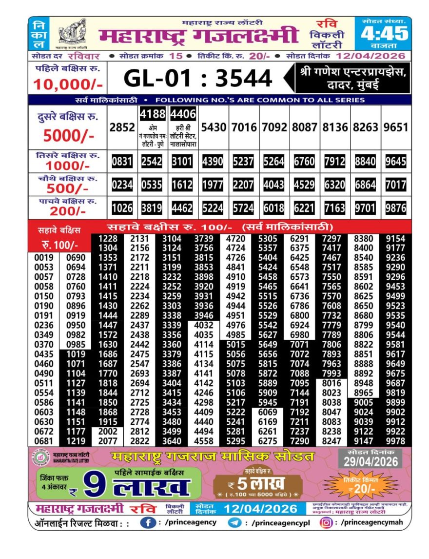 Maharashtra Gajlaxmi Lottery Result 12/04/26 12/04/26 Leave a Comment on Maharashtra Gajlaxmi Lottery Result 12/04/26 Share: XFacebookPinterestRedditVKDiggLinkedinMix Related Articles 0 150 Maharashtra Gajlaxmi lottery result 6/4/25 0 232 Maharashtra Gajlaxmi Lottery Result 21/12/25 0 215 Maharashtra Gajlaxmi Lottery Result 07/11/25 0 206 Maharashtra Gaj Laxmi Lottery Result 04/02/26