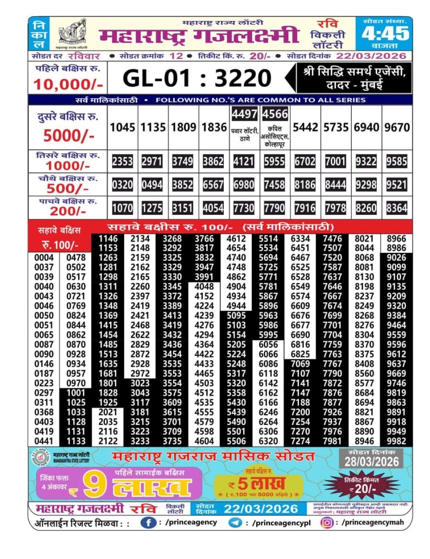 Maharashtra Gajlaxmi Lottery Result 22/03/26 22/03/26 Leave a Comment on Maharashtra Gajlaxmi Lottery Result 22/03/26 Share: XFacebookPinterestRedditVKDiggLinkedinMix Related Articles 0 178 Maharashtra Gajlaxmi lottery result 6/3/25 0 187 Maharashtra Gajlaxmi Lottery Result 08/12/25 0 271 Maharashtra Gajlaxmi Lottery Result 25/10/25 0 323 Maharashtra Gajlaxmi Lottery Result 16/09/25