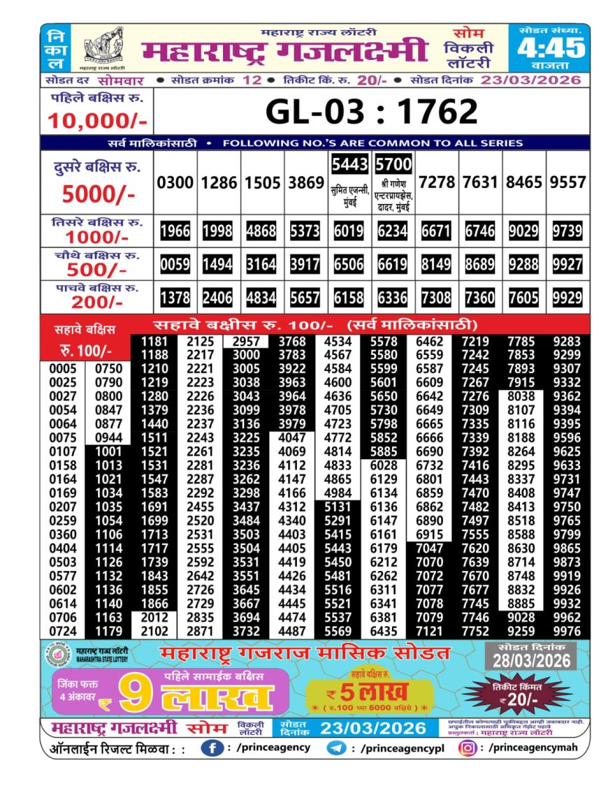 Maharashtra Gajlaxmi Lottery Result 23/03/26 23/03/26 Leave a Comment on Maharashtra Gajlaxmi Lottery Result 23/03/26 Share: XFacebookPinterestRedditVKDiggLinkedinMix Related Articles 0 277 Maharashtra Gajlaxmi Lottery Result 28/02/26 0 183 Maharashtra Gajlaxmi lottery result 28/3/25 0 214 Maharashtra Gajlaxmi Lottery Result 11/11/25 0 291 Maharashtra Gajlaxmi Lottery Result 07/03/26