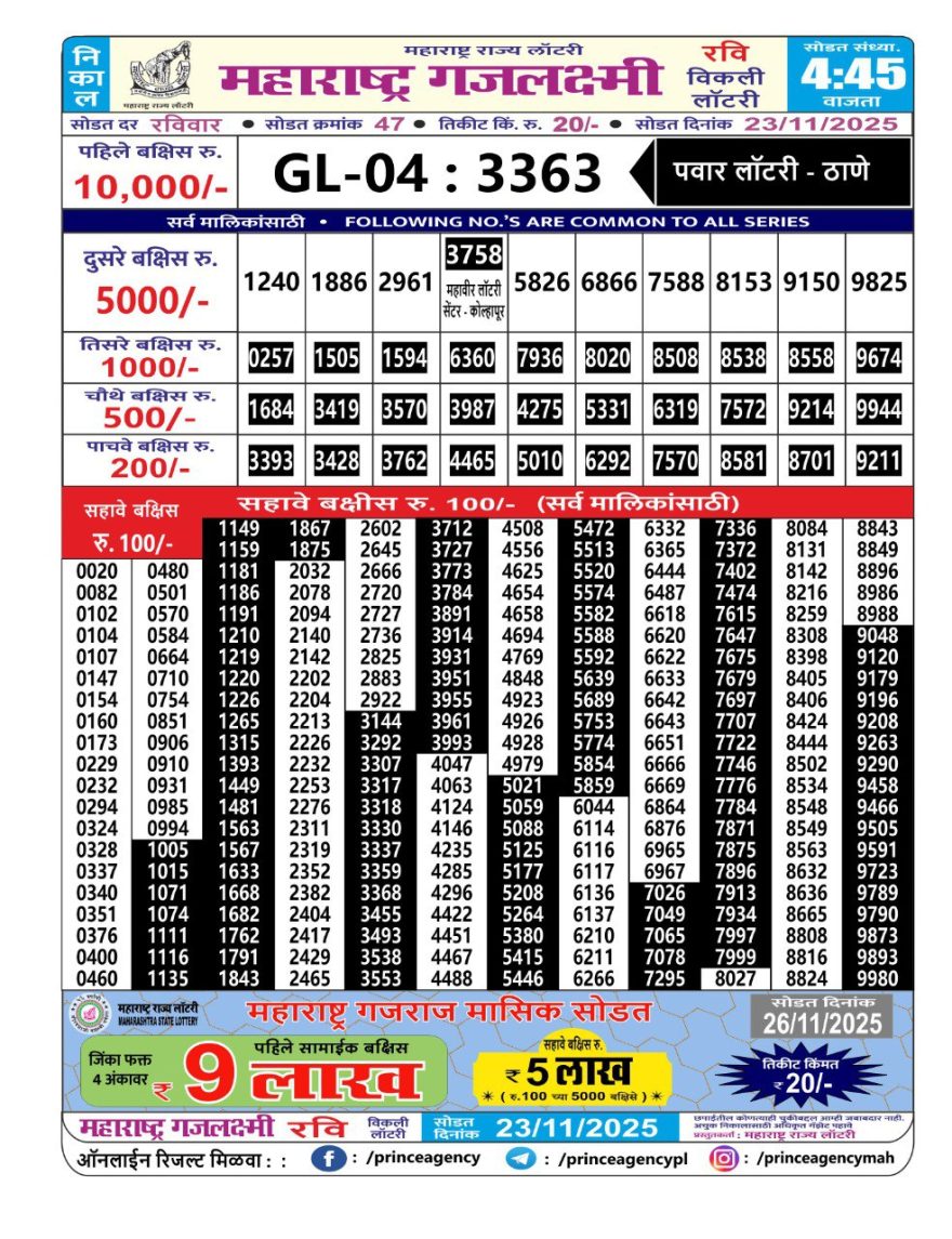 Maharashtra Gajlaxmi Lottery Result 23/11/25 23/11/25 Leave a Comment on Maharashtra Gajlaxmi Lottery Result 23/11/25 Share: XFacebookPinterestRedditVKDiggLinkedinMix Related Articles 0 96 Maharashtra Gaj Laxmi Lottery Result 28/08/25 0 73 Maharashtra Gaj Laxmi Lottery Result 21/08/25 0 133 Maharashtra Gajlaxmi Lottery Result 20/10/25 0 90 Maharashtra Gajlaxmi Lottery Result 11/11/25