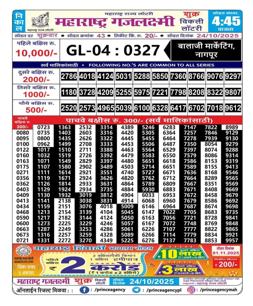 Maharashtra Gajlaxmi Lottery Result 24/10/25 24/10/25 Leave a Comment on Maharashtra Gajlaxmi Lottery Result 24/10/25 Share: XFacebookPinterestRedditVKDiggLinkedinMix Related Articles 0 40 Maharashtra Gajlaxmi Lottery Result 26/10/25 0 75 Maharashtra Gaj Laxmi Lottery Result 22/10/25 0 46 Maharashtra Gajlaxmi lottery result 15/3/25 0 58 Maharashtra Gajlaxmi Lottery Result 13/5/25
