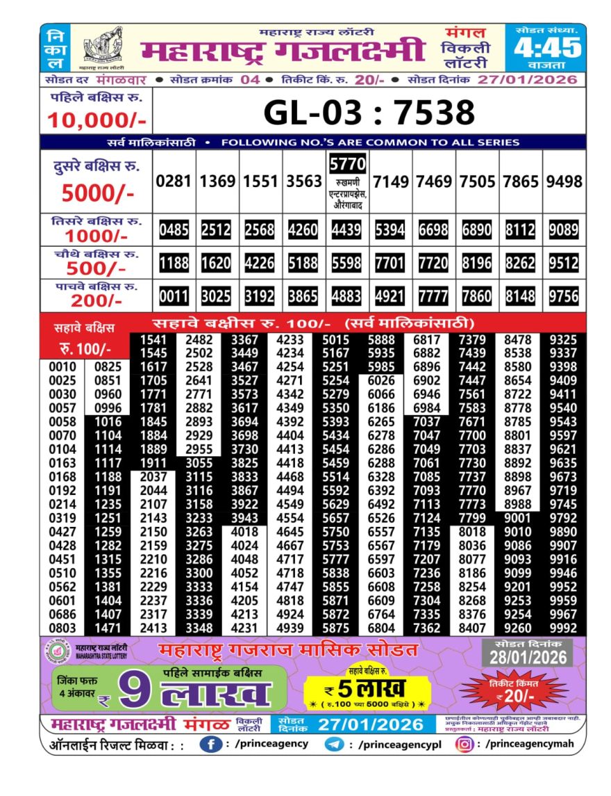 Maharashtra Gajlaxmi Lottery Result 27/01/26 27/01/26 Leave a Comment on Maharashtra Gajlaxmi Lottery Result 27/01/26 Share: XFacebookPinterestRedditVKDiggLinkedinMix Related Articles 0 305 Maharashtra Gajlaxmi Lottery Result 14/02/26 0 256 Maharashtra Gajlaxmi Lottery Result 19/09/25 0 212 Maharashtra Gaj Laxmi Lottery Result 15/10/25 0 137 Maharashtra Gajlaxmi lottery result 5/5/25