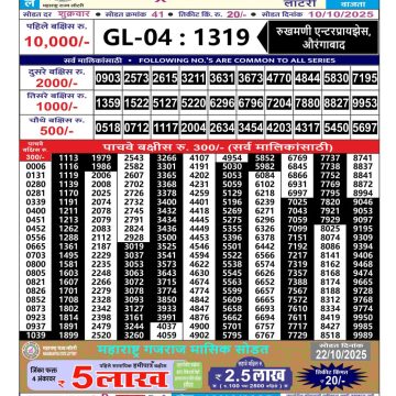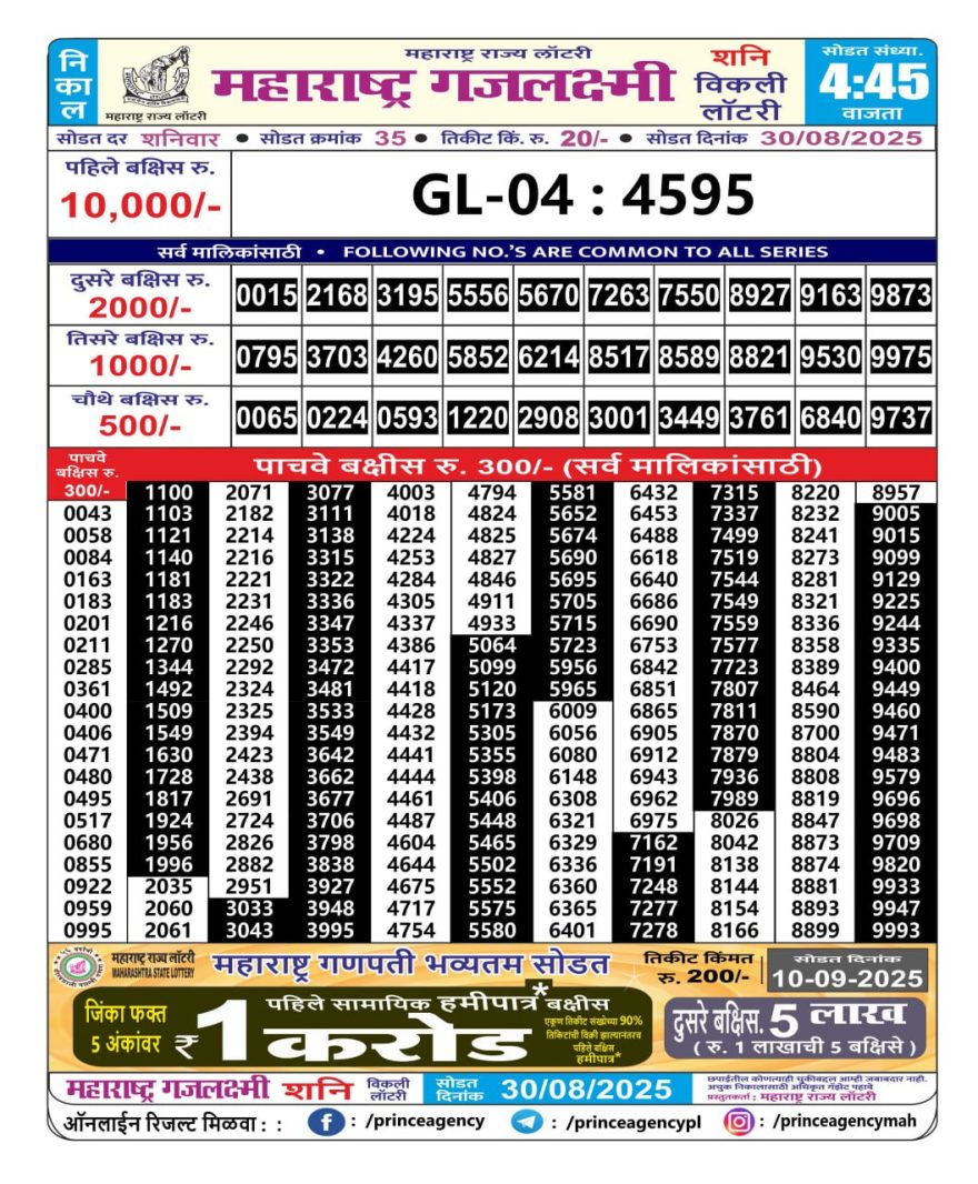 Maharashtra Gajlaxmi Lottery Result 30/08/25 30/08/25 Leave a Comment on Maharashtra Gajlaxmi Lottery Result 30/08/25 Share: XFacebookPinterestRedditVKDiggLinkedinMix Related Articles 0 35 Maharashtra Gajlaxmi Lottery Result 08/08/25 0 87 Maharashtra Gajlaxmi Lottery Result 31/05/25 0 33 Maharashtra Gajlaxmi lottery result 5/4/25 0 116 Maharashtra Gajlaxmi Lottery Result 10/10/25