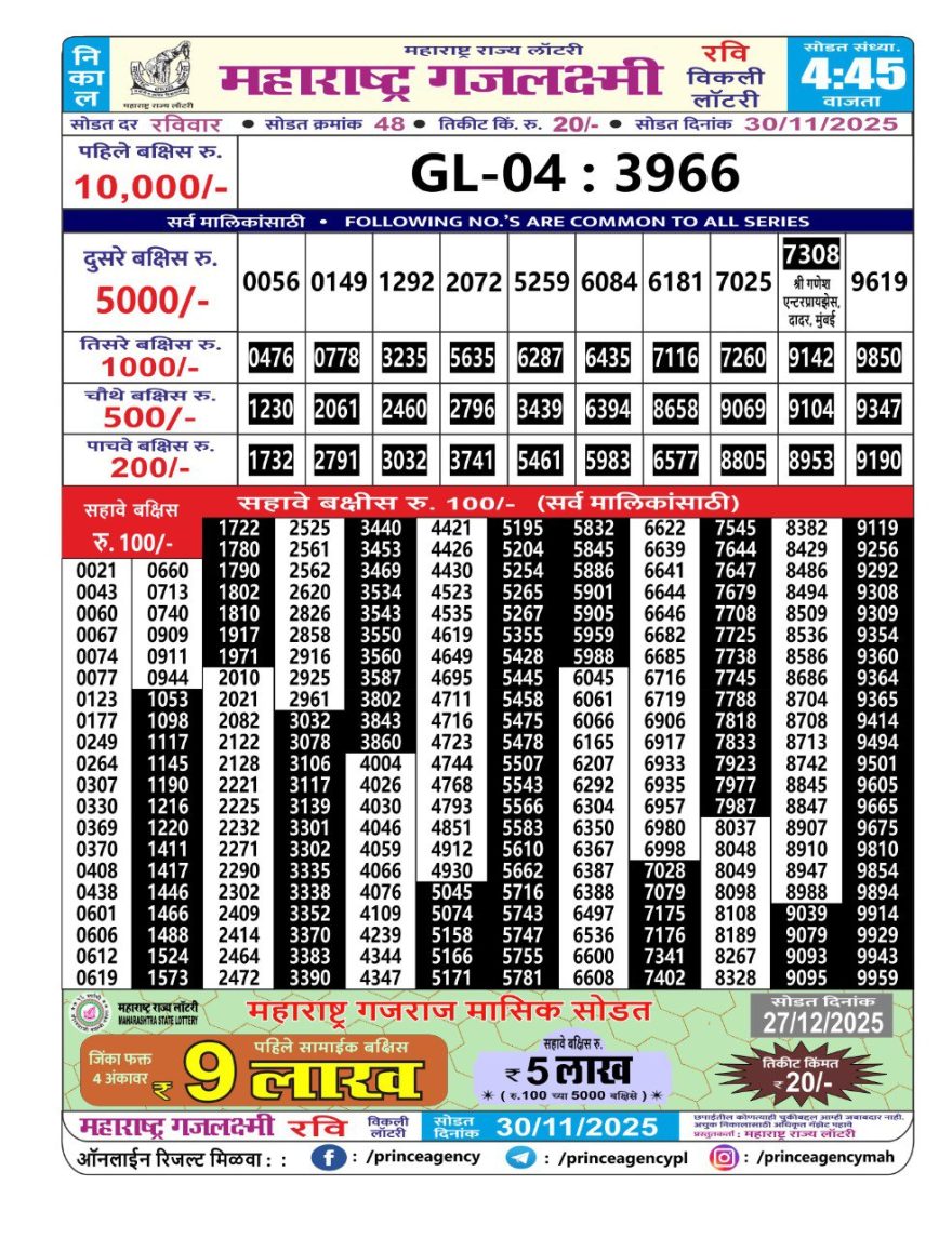 Maharashtra Gajlaxmi Lottery Result 30/11/25 30/11/25 Leave a Comment on Maharashtra Gajlaxmi Lottery Result 30/11/25 Share: XFacebookPinterestRedditVKDiggLinkedinMix Related Articles 0 55 Maharashtra Gaj Laxmi Lottery Result 10/07/25 0 53 Maharashtra Gajlaxmi lottery result 23/3/25 0 66 Maharashtra Gajlaxmi lottery result 20/3/25 0 60 Maharashtra Gajlaxmi lottery result 10/3/25