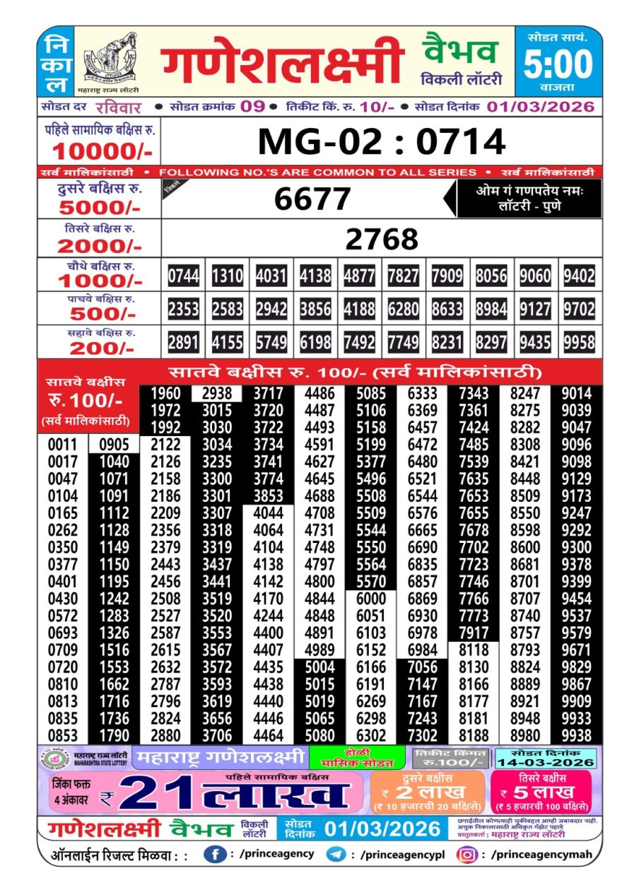 Maharashtra Ganesh Laxmi Lottery Result 01/03/26 01/03/26 Leave a Comment on Maharashtra Ganesh Laxmi Lottery Result 01/03/26 Share: XFacebookPinterestRedditVKDiggLinkedinMix Related Articles 0 184 Maharashtra Ganeshlaxmi lottery result 6/3/24 0 220 Maharashtra Ganesh Laxmi Lottery Result 10/5/25 0 233 Maharashtra Ganesh Laxmi Lottery Result 23/08/25 0 275 Maharashtra Ganesh laxmi lottery result 1/5/25