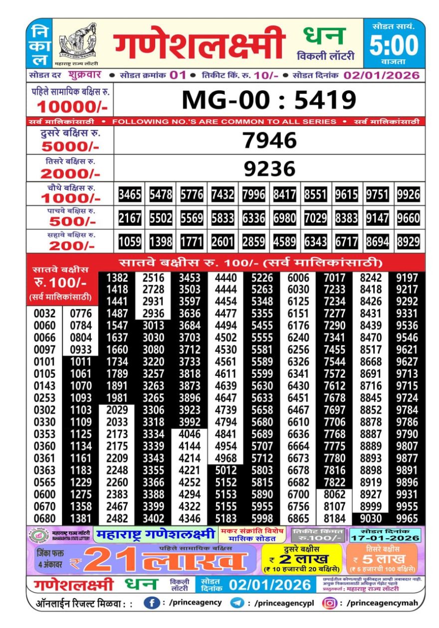 Maharashtra Ganesh Laxmi Lottery Result 02/01/26 02/01/26 Leave a Comment on Maharashtra Ganesh Laxmi Lottery Result 02/01/26 Share: XFacebookPinterestRedditVKDiggLinkedinMix Related Articles 0 110 Maharashtra Ganesh Laxmi Lottery Result 28/07/25 0 133 Maharashtra Ganesh Laxmi Lottery Result 11/08/25 0 107 Maharashtra Ganesh Laxmi Lottery Result 13/06/25 0 106 Maharashtra Ganesh Laxmi Lottery Result 11/07/25