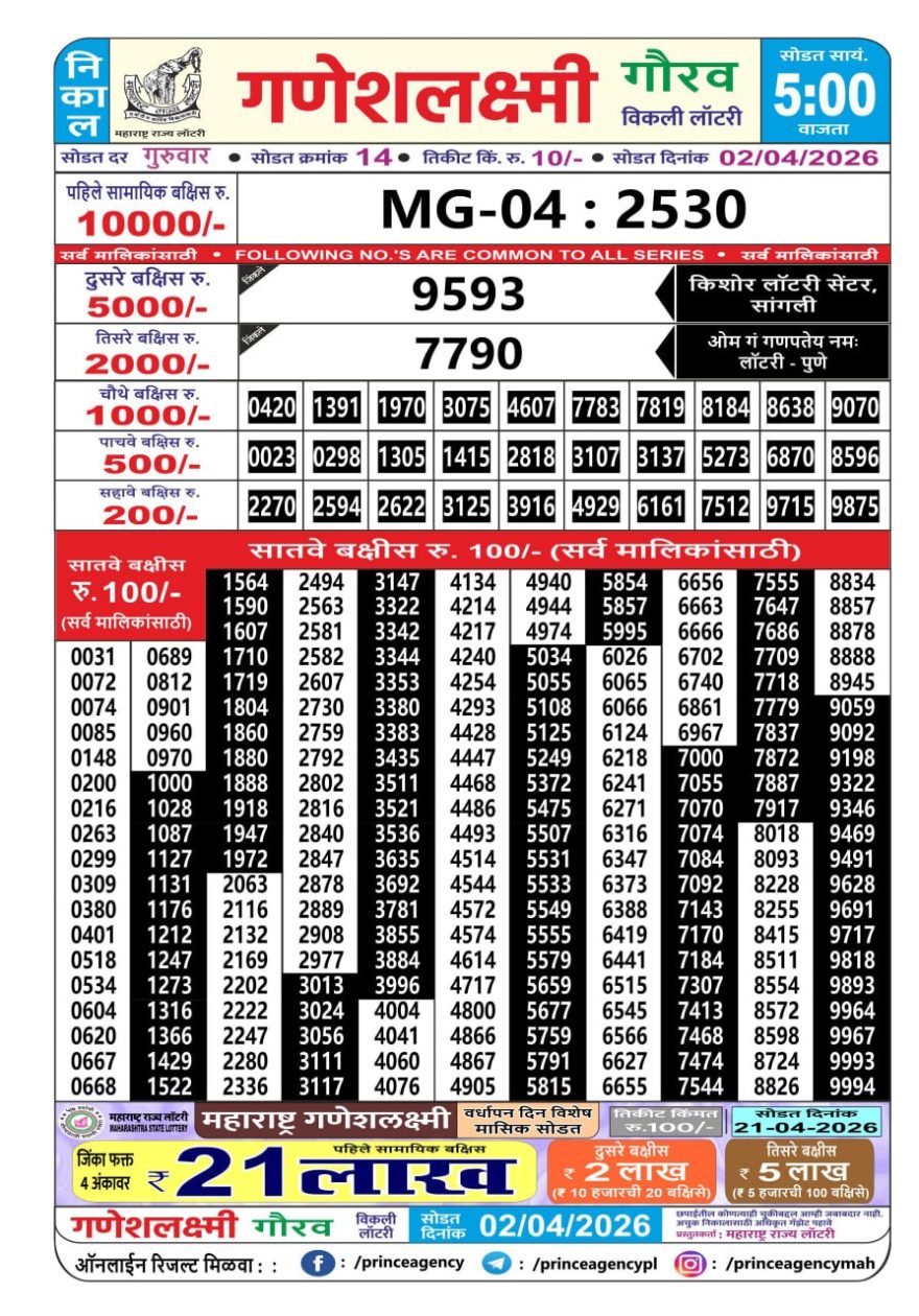Maharashtra Ganesh Laxmi Lottery Result 02/04/26 02/04/26 Leave a Comment on Maharashtra Ganesh Laxmi Lottery Result 02/04/26 Share: XFacebookPinterestRedditVKDiggLinkedinMix Related Articles 0 432 Maharashtra Ganesh Laxmi Lottery Result 23/03/26 0 224 Maharashtra Ganesh Laxmi Lottery Result 04/01/26 0 259 Maharashtra Ganesh Laxmi Lottery Result 29/01/26 0 251 Maharashtra Ganesh laxmi lottery result 11/3/25