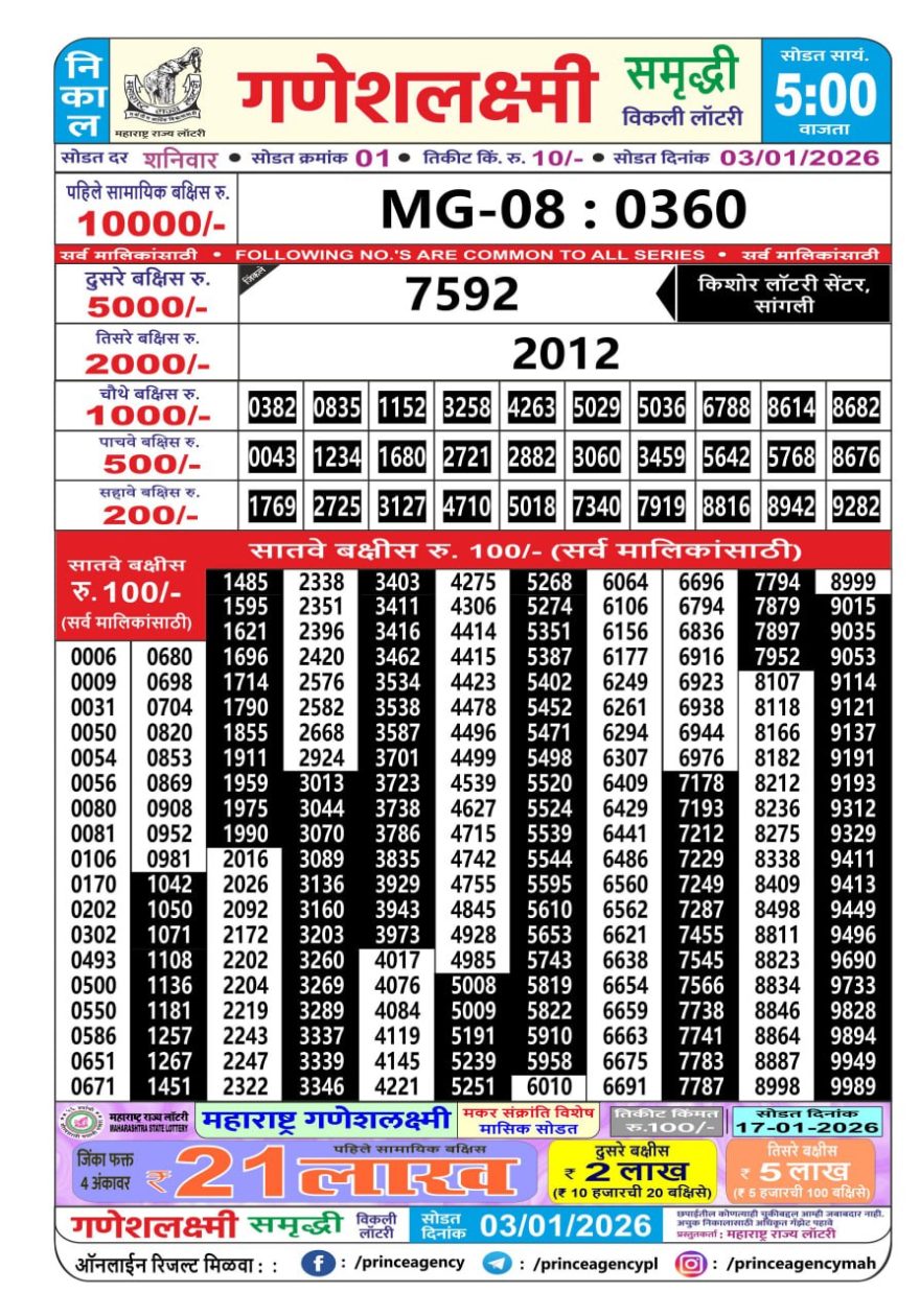 Maharashtra Ganesh Laxmi Lottery Result 03/01/26 03/01/26 Leave a Comment on Maharashtra Ganesh Laxmi Lottery Result 03/01/26 Share: XFacebookPinterestRedditVKDiggLinkedinMix Related Articles 0 198 Maharashtra Ganesh Laxmi Lottery Result 23/09/25 0 135 Maharashtra Ganesh Laxmi Lottery Result 13/11/25 0 102 Maharashtra Ganesh Laxmi Lottery Result 30/12/25 0 133 Maharashtra Ganesh Laxmi Lottery Result 05/12/25