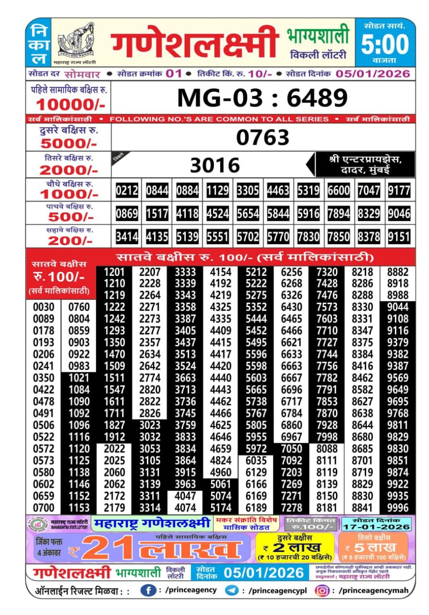 Maharashtra Ganesh Laxmi Lottery Result 05/01/26 05/01/26 Leave a Comment on Maharashtra Ganesh Laxmi Lottery Result 05/01/26 Share: XFacebookPinterestRedditVKDiggLinkedinMix Related Articles 0 101 Maharashtra Ganesh Laxmi Lottery Result 29/12/25 0 102 Maharashtra Ganesh Laxmi Lottery Result 30/12/25 0 95 Maharashtra Ganesh Laxmi Lottery Result 11/06/25 0 128 Maharashtra Ganesh Laxmi Lottery Result 13/5/25