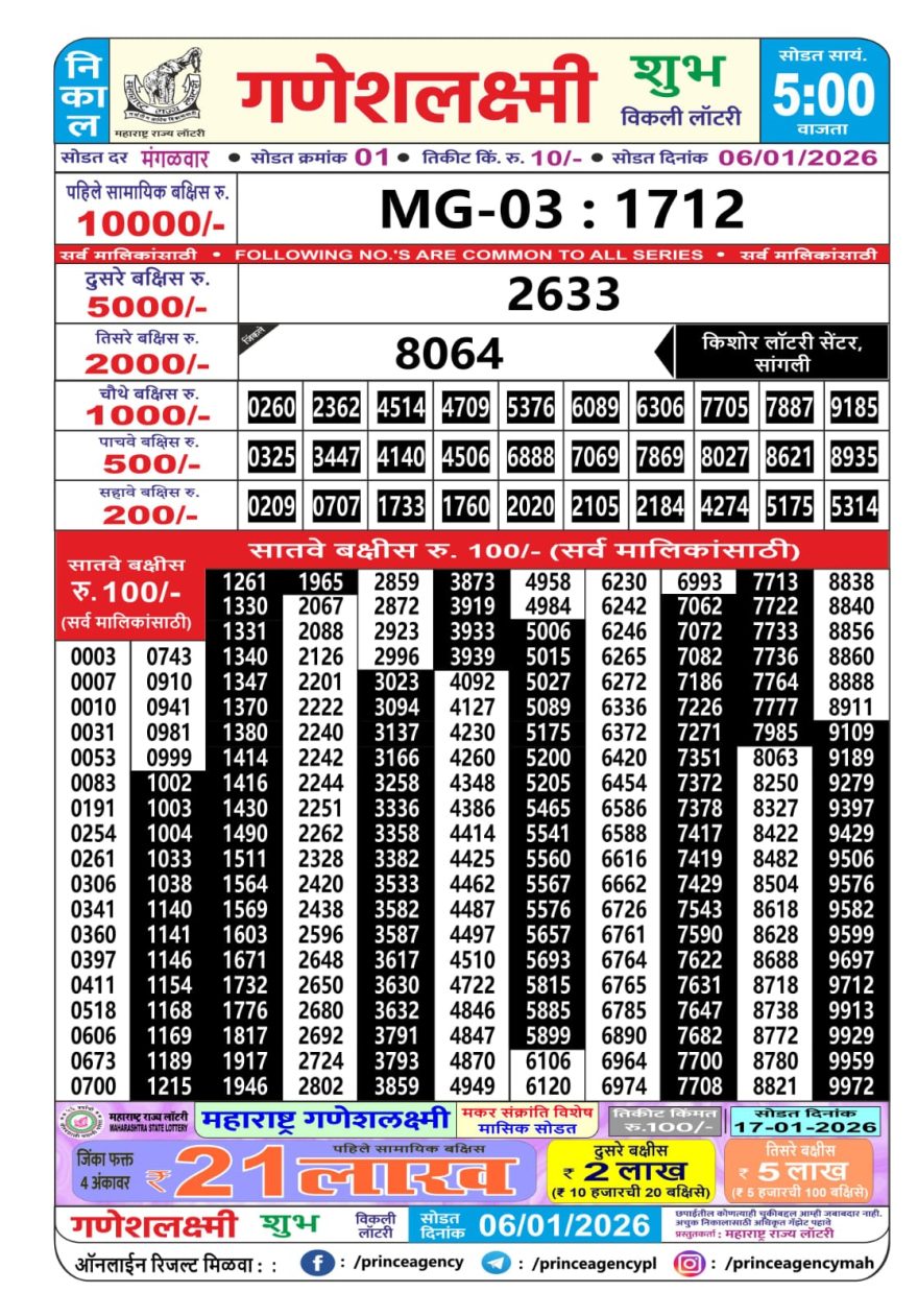 Maharashtra Ganesh Laxmi Lottery Result 06/01/26 06/01/26 Leave a Comment on Maharashtra Ganesh Laxmi Lottery Result 06/01/26 Share: XFacebookPinterestRedditVKDiggLinkedinMix Related Articles 0 220 Maharashtra Ganesh Laxmi Lottery Result 27/09/25 0 119 Maharashtra Ganesh laxmi lottery result 28/3/25 0 165 Maharashtra Ganesh laxmi lottery result 8/5/25 0 206 Maharashtra Ganesh Laxmi Lottery Result 18/10/25