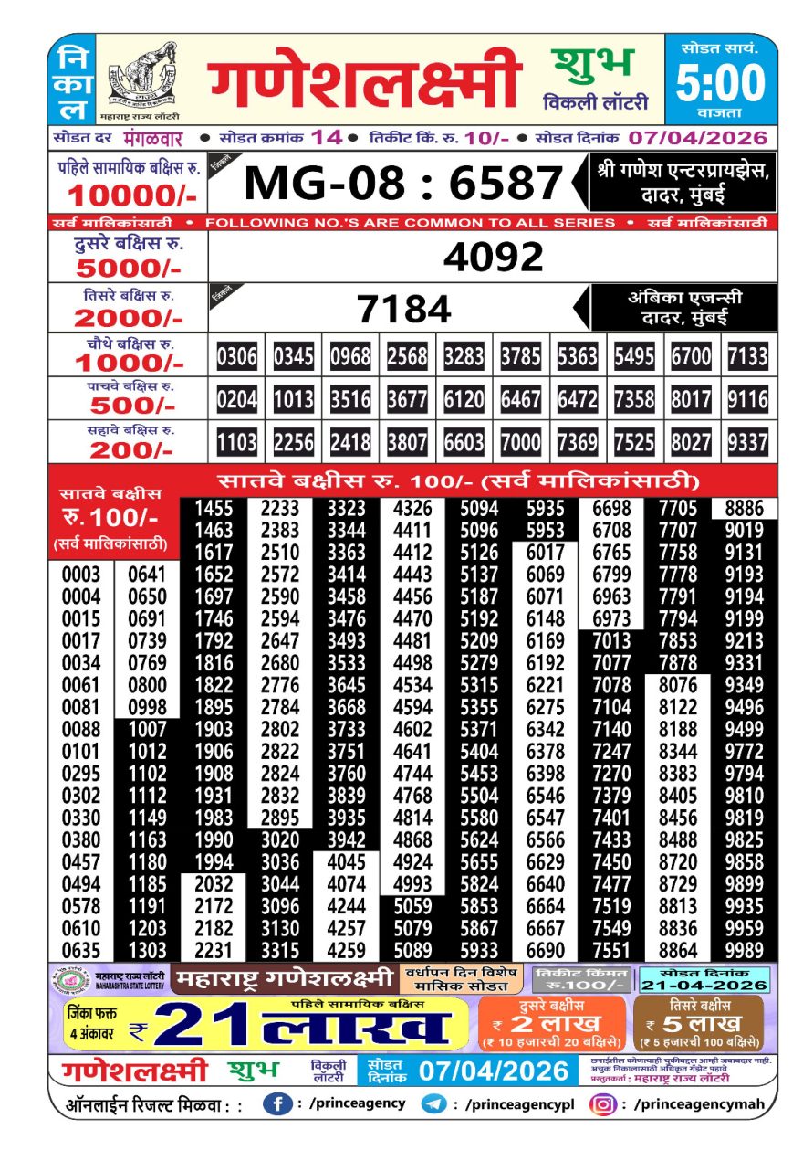 Maharashtra Ganesh Laxmi Lottery Result 07/04/26 07/04/26 Leave a Comment on Maharashtra Ganesh Laxmi Lottery Result 07/04/26 Share: XFacebookPinterestRedditVKDiggLinkedinMix Related Articles 0 275 Maharashtra Ganesh Laxmi Lottery Result 01/11/25 0 272 Maharashtra Ganesh Laxmi Lottery Result 06/01/26 0 250 Maharashtra Ganesh Laxmi Lottery Result 08/08/25 0 289 Maharashtra Ganesh laxmi lottery result 3/3/25