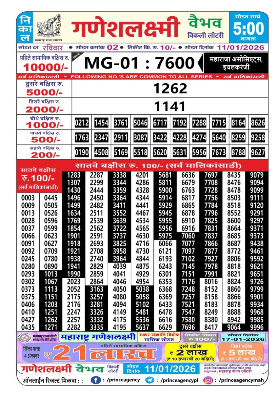 Maharashtra Ganesh Laxmi Lottery Result 11/01/26 11/01/26 Leave a Comment on Maharashtra Ganesh Laxmi Lottery Result 11/01/26 Share: XFacebookPinterestRedditVKDiggLinkedinMix Related Articles 0 215 Maharashtra Ganesh Laxmi Lottery Result 25/10/25 0 112 Maharashtra Ganesh Laxmi Lottery Result 31/12/25 0 104 Maharashtra Ganesh Laxmi Lottery Result 22/06/25 0 194 Maharashtra Ganesh Laxmi Lottery Result 07/11/25