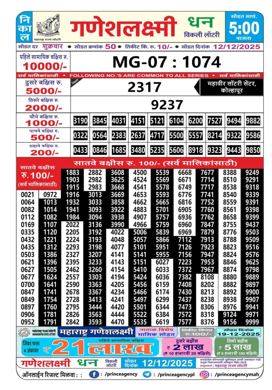 Maharashtra Ganesh Laxmi Lottery Result 12/12/25 12/12/25 Leave a Comment on Maharashtra Ganesh Laxmi Lottery Result 12/12/25 Share: XFacebookPinterestRedditVKDiggLinkedinMix Related Articles 0 125 Maharashtra Ganesh Laxmi Lottery Result 09/11/25 0 42 Maharashtra Ganesh Laxmi Lottery Result 20/12/25 0 123 Maharashtra Ganesh laxmi lottery result 19/3/25 0 92 Maharashtra Ganesh Laxmi Lottery Result 14/07/25
