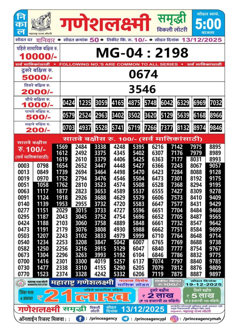 Maharashtra Ganesh Laxmi Lottery Result 13/12/25 13/12/25 Leave a Comment on Maharashtra Ganesh Laxmi Lottery Result 13/12/25 Share: XFacebookPinterestRedditVKDiggLinkedinMix Related Articles 0 125 Maharashtra Ganesh Laxmi Lottery Result 1/06/25 0 119 Maharashtra Ganesh Laxmi Lottery Result 12/5/25 0 168 Maharashtra Ganesh Laxmi Lottery Result 28/05/25 0 82 Maharashtra Ganesh Laxmi Lottery Result 04/07/25