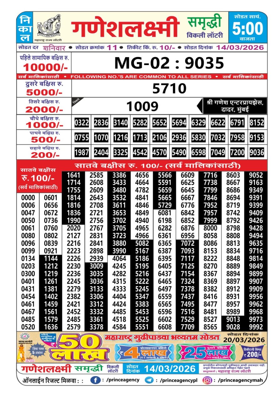 Maharashtra Ganesh Laxmi Lottery Result 14/03/26 14/03/26 Leave a Comment on Maharashtra Ganesh Laxmi Lottery Result 14/03/26 Share: XFacebookPinterestRedditVKDiggLinkedinMix Related Articles 0 242 Maharashtra Ganesh Laxmi Lottery Result 31/01/26 0 397 Maharashtra Ganesh Laxmi Lottery Result 13/02/26 0 467 Maharashtra Ganesh Laxmi Lottery Result 18/03/26 0 213 Maharashtra Ganesh Laxmi Lottery Result 18/06/25