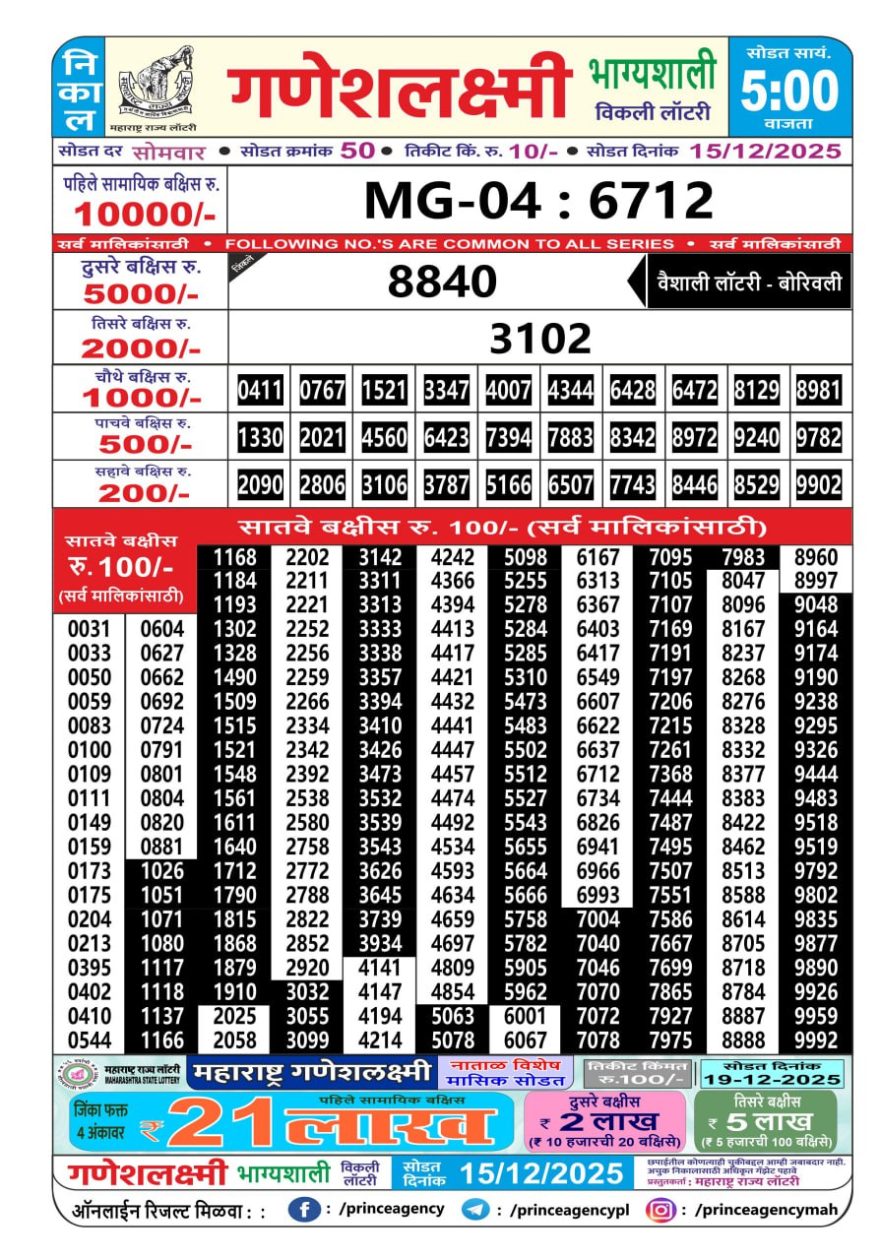 Maharashtra Ganesh Laxmi Lottery Result 15/12/25 15/12/25 Leave a Comment on Maharashtra Ganesh Laxmi Lottery Result 15/12/25 Share: XFacebookPinterestRedditVKDiggLinkedinMix Related Articles 0 92 Maharashtra Gajlaxmi lottery result 15/4/25 0 102 Maharashtra Ganesh laxmi lottery result 30/4/25 0 138 Maharashtra Ganesh laxmi lottery result 8/5/25 0 18 Maharashtra Ganesh Laxmi Lottery Result 22/12/25