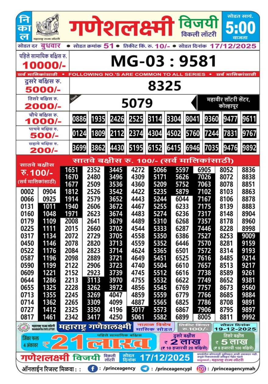Maharashtra Ganesh Laxmi Lottery Result 17/12/25 17/12/25 Leave a Comment on Maharashtra Ganesh Laxmi Lottery Result 17/12/25 Share: XFacebookPinterestRedditVKDiggLinkedinMix Related Articles 0 122 Maharashtra Ganesh Laxmi Lottery Result 06/06/25 0 123 Maharashtra Ganesh Laxmi Lottery Result 24/11/25 0 100 Maharashtra Ganesh Laxmi Lottery Result 08/08/25 0 205 Maharashtra Ganesh Laxmi Lottery Result 11/09/25