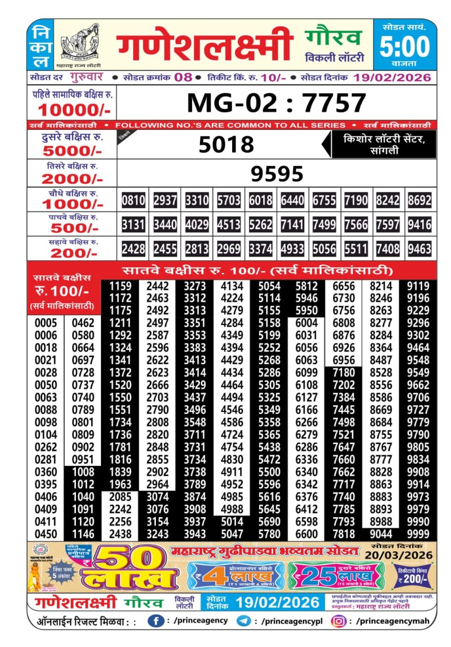 Maharashtra Ganesh Laxmi Lottery Result 19/02/26 19/02/26 Leave a Comment on Maharashtra Ganesh Laxmi Lottery Result 19/02/26 Share: XFacebookPinterestRedditVKDiggLinkedinMix Related Articles 0 133 Maharashtra Ganesh laxmi lottery result 6/4/25 0 263 Maharashtra Ganesh Laxmi Lottery Result 19/10/25 0 214 Maharashtra Ganesh Laxmi Lottery Result 24/08/25 0 245 Maharashtra Ganesh laxmi lottery result 9/3/25
