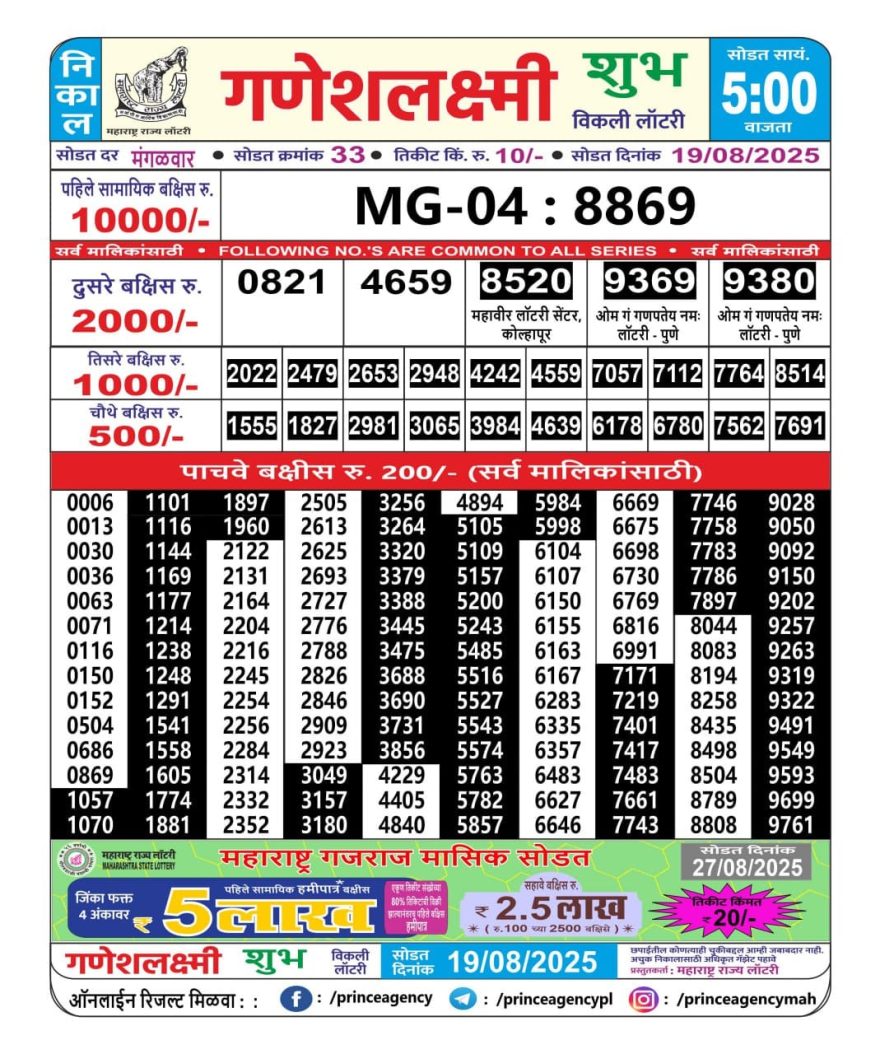 Maharashtra Ganesh Laxmi Lottery Result 19/08/25 19/08/25 Leave a Comment on Maharashtra Ganesh Laxmi Lottery Result 19/08/25 Share: XFacebookPinterestRedditVKDiggLinkedinMix Related Articles 0 53 Maharashtra Ganesh Laxmi Lottery Result 07/06/25 0 37 Maharashtra Ganesh Laxmi Lottery Result 15/5/25 0 105 Maharashtra Ganesh Laxmi Lottery Result 25/09/25 0 52 Maharashtra Ganesh Laxmi Lottery Result 08/06/25