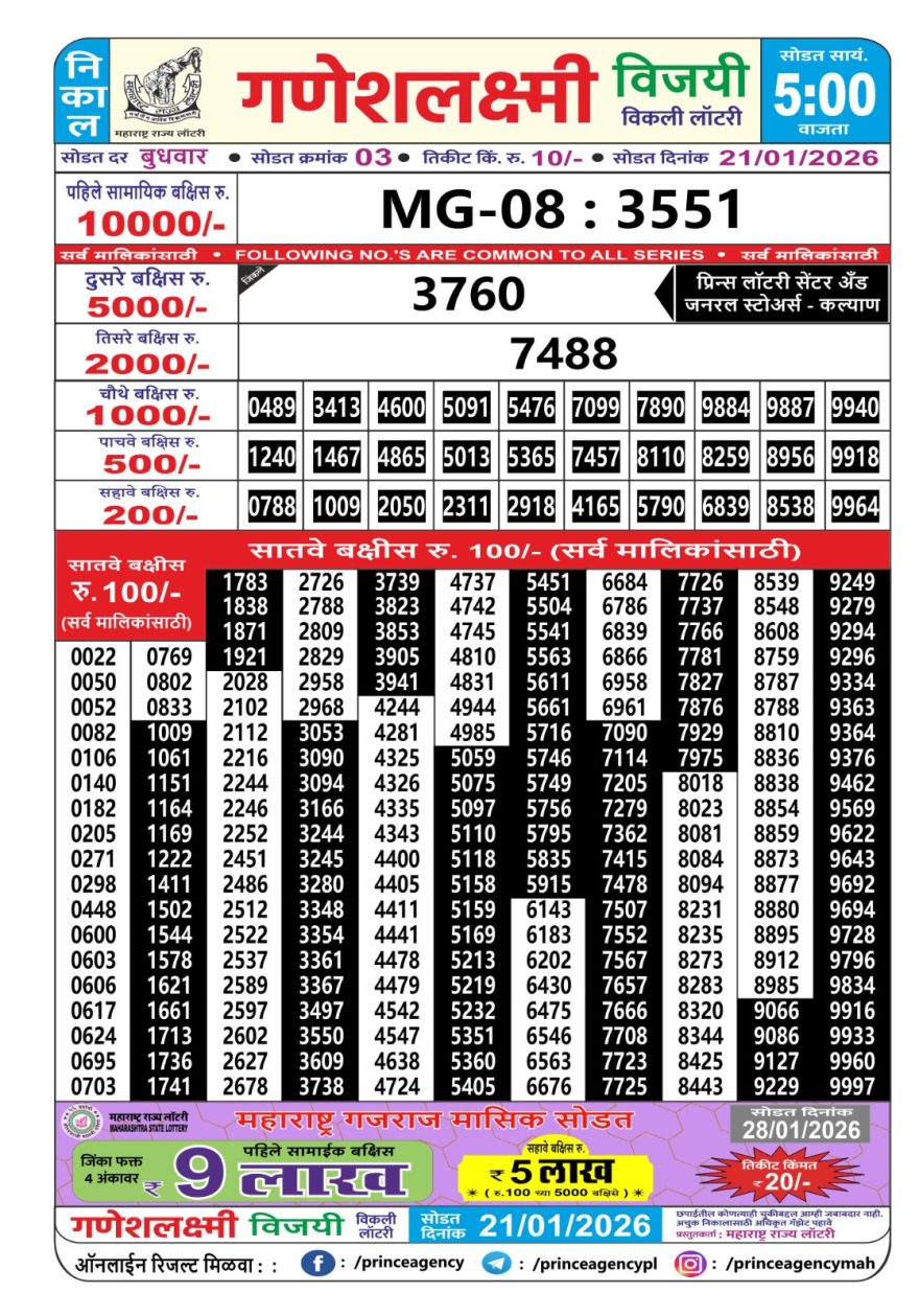 Maharashtra Ganesh Laxmi Lottery Result 21/01/26 21/01/26 Leave a Comment on Maharashtra Ganesh Laxmi Lottery Result 21/01/26 Share: XFacebookPinterestRedditVKDiggLinkedinMix Related Articles 0 192 Maharashtra Ganesh Laxmi Lottery Result 02/09/25 0 178 Maharashtra Ganesh Laxmi Lottery Result 24/01/26 0 198 Maharashtra Ganesh laxmi lottery result 1/5/25 0 157 Maharashtra Ganesh Laxmi Lottery Result 23/07/25