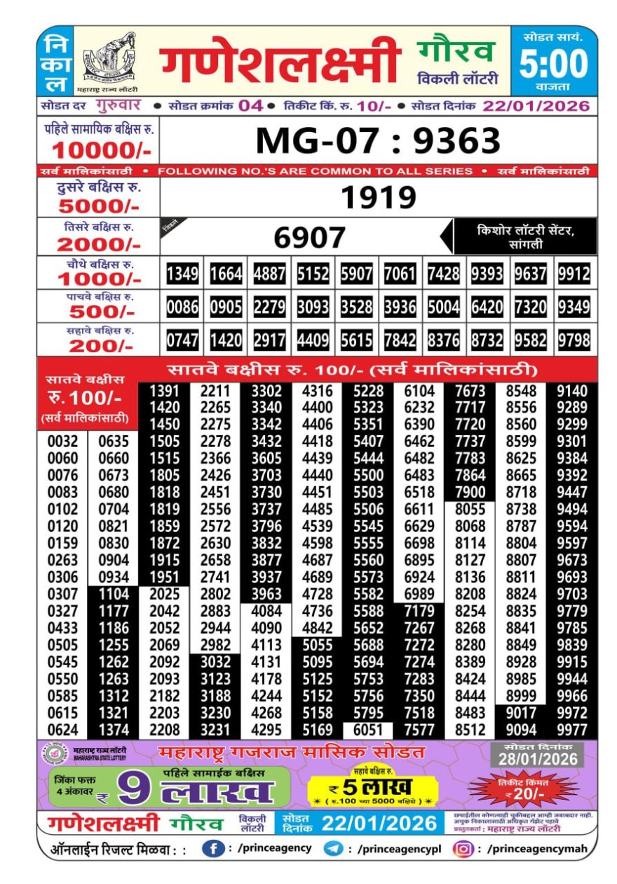 Maharashtra Ganesh Laxmi Lottery Result 22/01/26 22/01/26 Leave a Comment on Maharashtra Ganesh Laxmi Lottery Result 22/01/26 Share: XFacebookPinterestRedditVKDiggLinkedinMix Related Articles 0 221 Maharashtra Ganesh Laxmi Lottery Result 04/11/25 0 161 Maharashtra Ganesh Laxmi Lottery Result 21/06/25 0 204 Maharashtra Ganesh Laxmi Lottery Result 12/5/25 0 134 Maharashtra Gajlaxmi lottery result 7/4/25