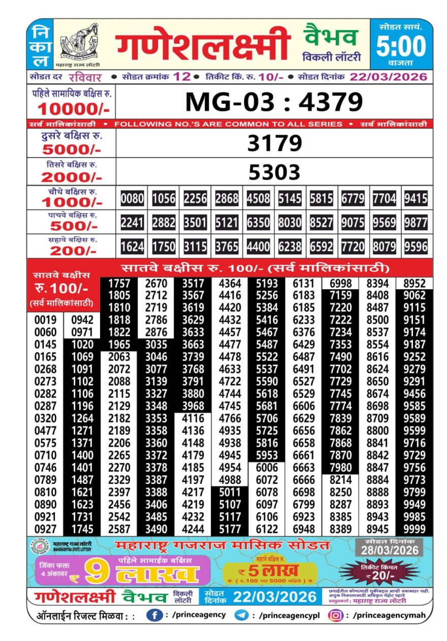 Maharashtra Ganesh Laxmi Lottery Result 22/03/26 22/03/26 Leave a Comment on Maharashtra Ganesh Laxmi Lottery Result 22/03/26 Share: XFacebookPinterestRedditVKDiggLinkedinMix Related Articles 0 194 Maharashtra Ganesh laxmi lottery result 10/3/25 0 226 Maharashtra Ganesh Laxmi Lottery Result 11/12/25 0 197 Maharashtra Gajlaxmi lottery result 7/4/25 0 286 Maharashtra Ganesh Laxmi Lottery Result 09/04/26