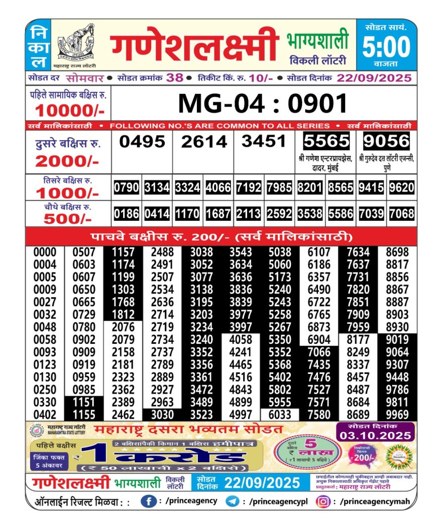 Maharashtra Ganesh Laxmi Lottery Result 22/09/25 22/09/25 Leave a Comment on Maharashtra Ganesh Laxmi Lottery Result 22/09/25 Share: XFacebookPinterestRedditVKDiggLinkedinMix Related Articles 0 76 Maharashtra Ganesh Laxmi Lottery Result 02/06/25 0 74 Maharashtra Ganesh Laxmi Lottery Result 21/08/25 0 72 Maharashtra Ganesh Laxmi Lottery Result 16/08/25 0 90 Maharashtra Ganesh Laxmi Lottery Result 20/5/25