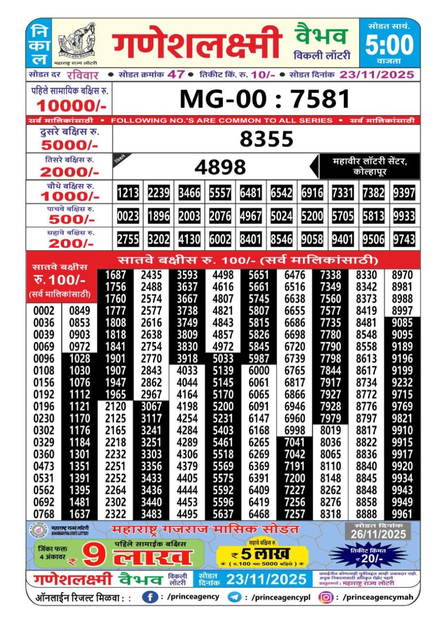 Maharashtra Ganesh Laxmi Lottery Result 23/11/25 23/11/25 Leave a Comment on Maharashtra Ganesh Laxmi Lottery Result 23/11/25 Share: XFacebookPinterestRedditVKDiggLinkedinMix Related Articles 0 131 Maharashtra Ganesh Laxmi Lottery Result 01/09/25 0 52 Maharashtra Ganesh laxmi lottery result 25/3/25 0 106 Maharashtra Ganesh Laxmi Lottery Result 20/08/25 0 66 Maharashtra Ganesh Laxmi Lottery Result 25/11/25