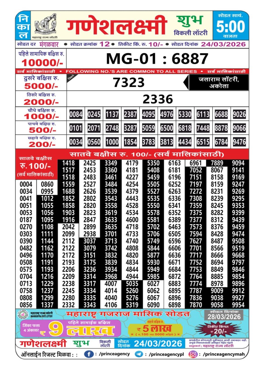 Maharashtra Ganesh Laxmi Lottery Result 24/03/26 24/03/26 Leave a Comment on Maharashtra Ganesh Laxmi Lottery Result 24/03/26 Share: XFacebookPinterestRedditVKDiggLinkedinMix Related Articles 0 253 Maharashtra Ganesh Laxmi Lottery Result 29/11/25 0 258 Maharashtra Ganesh Laxmi Lottery Result 11/04/26 1 318 Maharashtra Ganesh Laxmi Lottery Result 26/11/25 0 227 Maharashtra Ganesh Laxmi Lottery Result 17/01/26