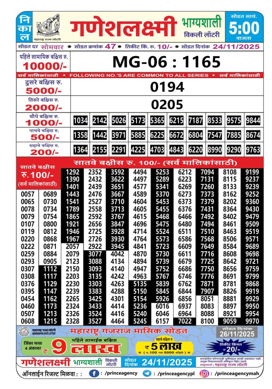 Maharashtra Ganesh Laxmi Lottery Result 24/11/25 24/11/25 Leave a Comment on Maharashtra Ganesh Laxmi Lottery Result 24/11/25 Share: XFacebookPinterestRedditVKDiggLinkedinMix Related Articles 0 93 Maharashtra Ganesh Laxmi Lottery Result 10/11/25 0 93 Maharashtra Ganesh Laxmi Lottery Result 16/11/25 0 140 Maharashtra Ganesh Laxmi Lottery Result 22/10/25 0 66 Maharashtra Ganesh laxmi lottery result 10/3/25
