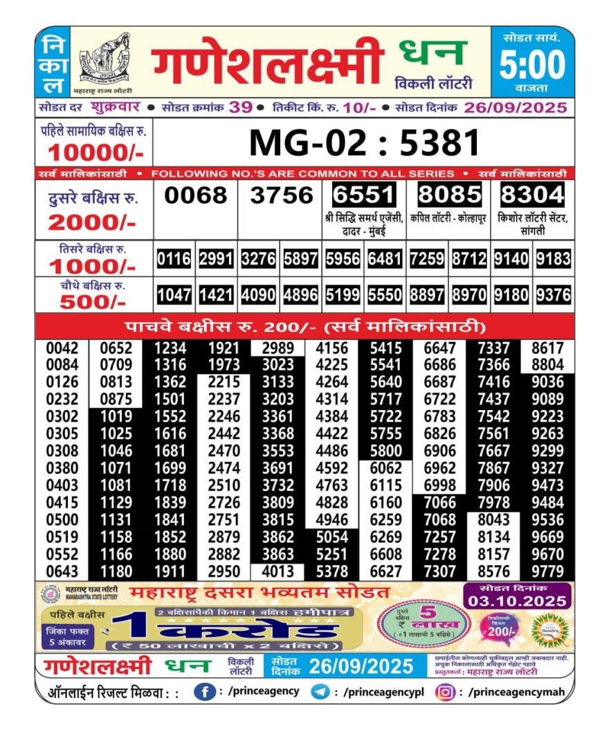 Maharashtra Ganesh Laxmi Lottery Result 26/09/25 26/09/25 Leave a Comment on Maharashtra Ganesh Laxmi Lottery Result 26/09/25 Share: XFacebookPinterestRedditVKDiggLinkedinMix Related Articles 0 37 Maharashtra Ganesh Laxmi Lottery Result 15/5/25 0 57 Maharashtra Ganeshlaxmi lottery result 5/3/24 0 66 Maharashtra Ganesh Laxmi Lottery Result 31/05/25 0 56 Maharashtra Ganesh Laxmi Lottery Result 03/06/25