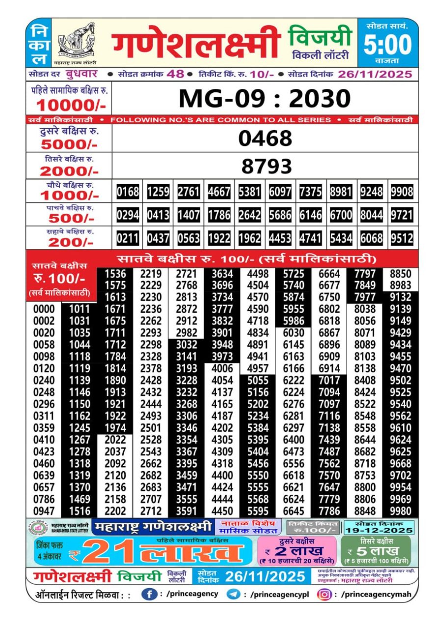 Maharashtra Ganesh Laxmi Lottery Result 26/11/25 26/11/25 Leave a Comment on Maharashtra Ganesh Laxmi Lottery Result 26/11/25 Share: XFacebookPinterestRedditVKDiggLinkedinMix Related Articles 0 93 Maharashtra Ganesh Laxmi Lottery Result 23/08/25 0 84 Maharashtra Ganesh Laxmi Lottery Result 09/08/25 0 84 Maharashtra Ganesh Laxmi Lottery Result 09/07/25 0 143 Maharashtra Ganesh Laxmi Lottery Result 13/10/25