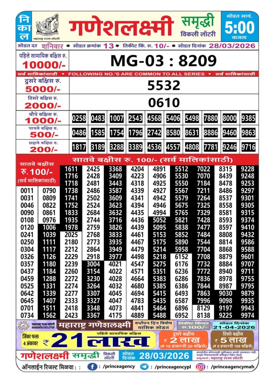 Maharashtra Ganesh Laxmi Lottery Result 28/03/26 28/03/26 Leave a Comment on Maharashtra Ganesh Laxmi Lottery Result 28/03/26 Share: XFacebookPinterestRedditVKDiggLinkedinMix Related Articles 0 370 Maharashtra Ganesh Laxmi Lottery Result 21/02/26 0 219 Maharashtra Ganesh laxmi lottery result 29/3/25 0 237 Maharashtra Ganesh Laxmi Lottery Result 03/02/26 0 234 Maharashtra Ganesh laxmi lottery result 26/4/25
