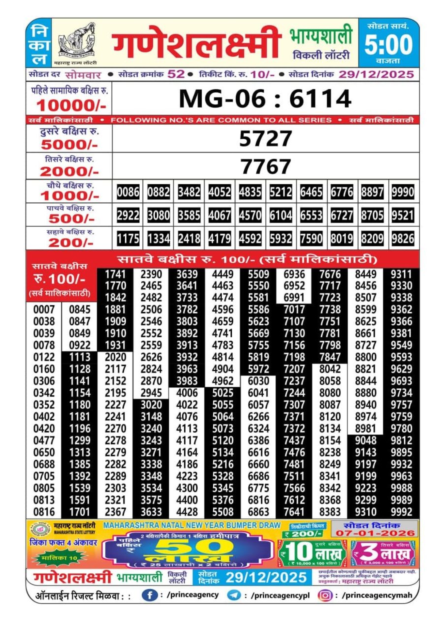 Maharashtra Ganesh Laxmi Lottery Result 29/12/25 29/12/25 Leave a Comment on Maharashtra Ganesh Laxmi Lottery Result 29/12/25 Share: XFacebookPinterestRedditVKDiggLinkedinMix Related Articles 0 101 Maharashtra Ganesh laxmi lottery result 24/3/25 0 107 Maharashtra Ganesh Laxmi Lottery Result 13/07/25 0 120 Maharashtra Ganesh Laxmi Lottery Result 08/12/25 0 100 Maharashtra Ganesh laxmi lottery result 21/3/25