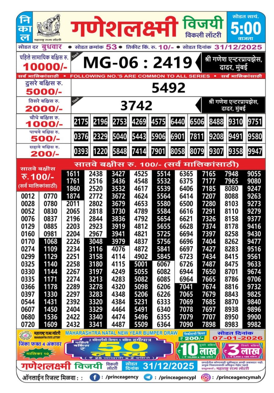Maharashtra Ganesh Laxmi Lottery Result 31/12/25 31/12/25 Leave a Comment on Maharashtra Ganesh Laxmi Lottery Result 31/12/25 Share: XFacebookPinterestRedditVKDiggLinkedinMix Related Articles 0 128 Maharashtra Ganesh Laxmi Lottery Result 17/08/25 0 117 Maharashtra Ganesh Laxmi Lottery Result 31/08/25 0 121 Maharashtra Ganesh Laxmi Lottery Result 17/5/25 0 127 Maharashtra Ganesh Laxmi Lottery Result 12/07/25