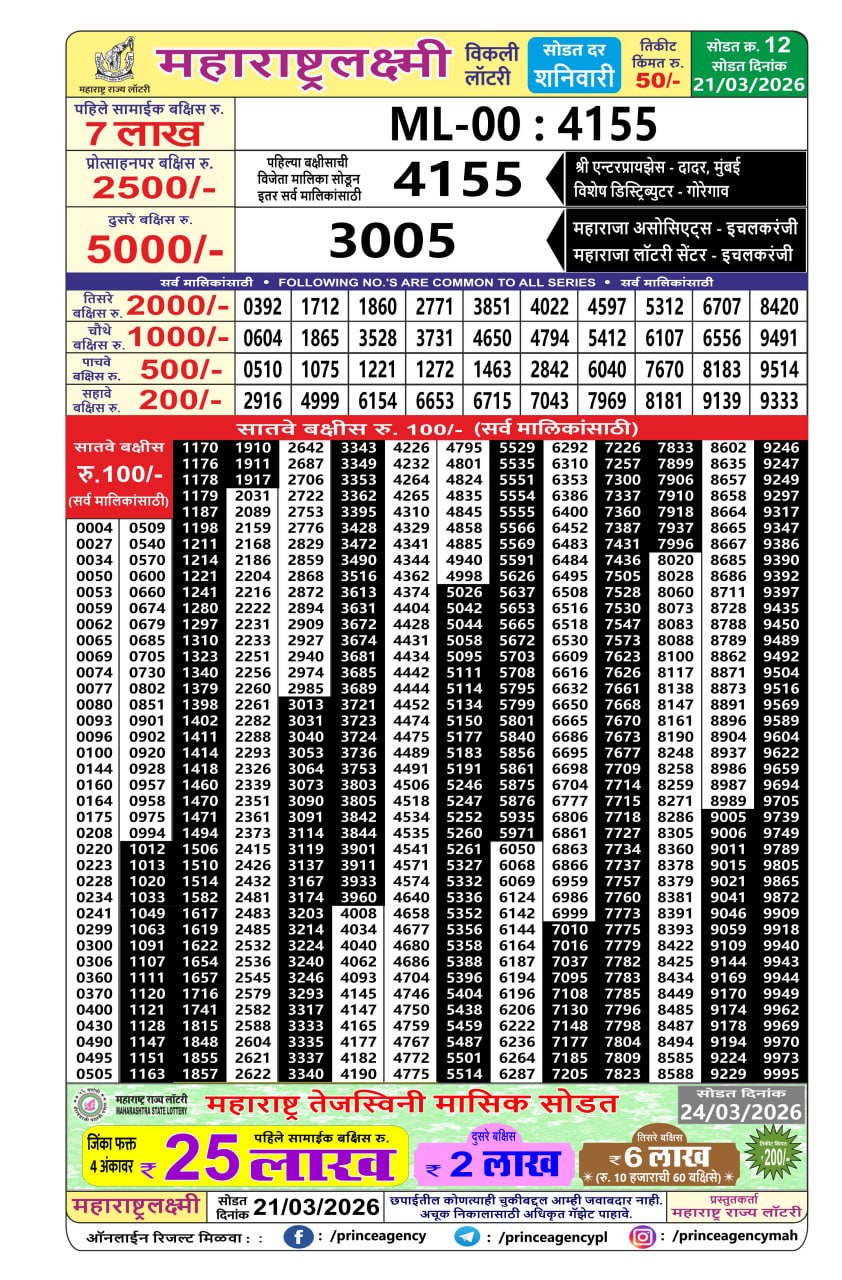Maharashtra Laxmi Weekly Lottery Result 21/03/26 21/03/26 Leave a Comment on Maharashtra Laxmi Weekly Lottery Result 21/03/26 Share: XFacebookPinterestRedditVKDiggLinkedinMix Related Articles 0 255 Maharashtra Laxmi Weekly Lottery Result 17/5/25 0 327 Maharashtra Akarshak Weekly Lottery Result 05/03/26 1 267 Maharashtra akarshak weekly lottery result 17/4/25 0 400 Maharashtra Sagar Laxmi weekly lottery result 06/04/2026
