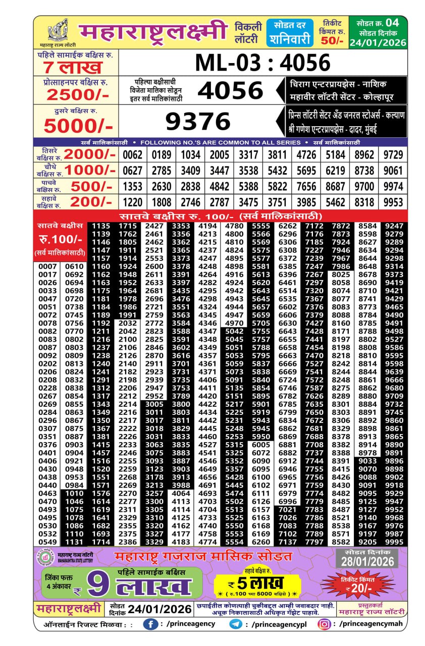 Maharashtra Laxmi Weekly Lottery Result 24/01/26 24/01/26 Leave a Comment on Maharashtra Laxmi Weekly Lottery Result 24/01/26 Share: XFacebookPinterestRedditVKDiggLinkedinMix Related Articles 0 152 Maharashtra Vaibhav Laxmi Weekly Lottery Result 20/06/25 0 125 Maharashtra Akarshak Weekly Lottery Result 17/07/25 0 143 Maharashtra Vaibhav Laxmi Weekly Lottery Result 27/06/25 0 126 Maharashtra Padmini lottery result 11/3/25