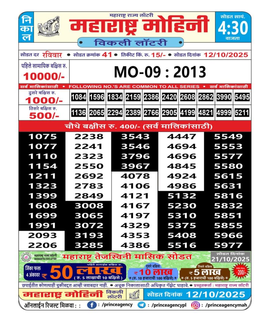 Maharashtra Mohini Lottery Result 12/10/25 12/10/25 Leave a Comment on Maharashtra Mohini Lottery Result 12/10/25 Share: XFacebookPinterestRedditVKDiggLinkedinMix Related Articles 0 93 Maharashtra Sahyadri Weekly Lottery Result 07/10/25 0 40 Maharashtra Sahyadri weekly lottery result 7/5/25 0 39 Maharashtra Sahyadri Weekly Lottery Result 30/07/25 0 88 Maharashtra Sahyadri Weekly Lottery Result 16/10/25