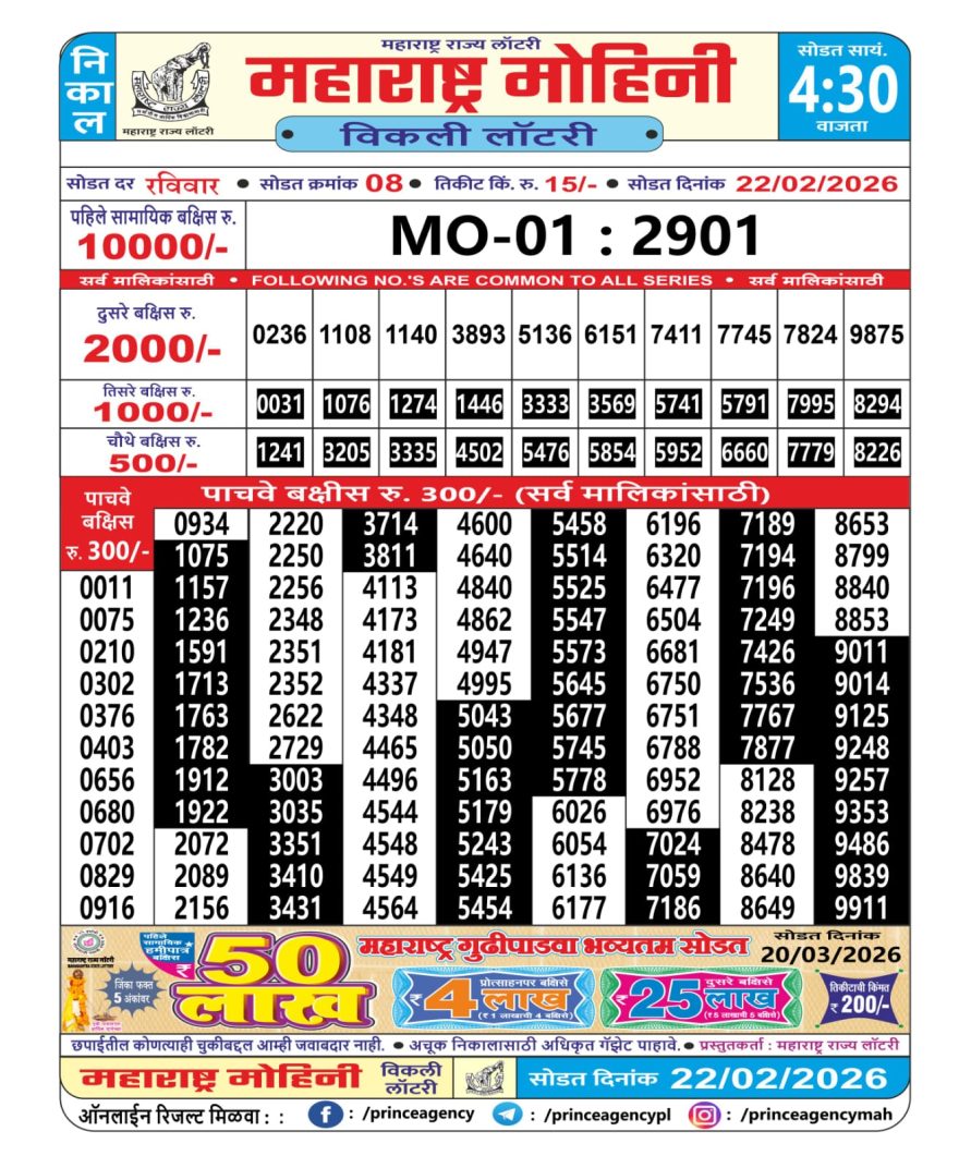 Maharashtra Mohini Lottery Result 22/02/26 22/02/26 Leave a Comment on Maharashtra Mohini Lottery Result 22/02/26 Share: XFacebookPinterestRedditVKDiggLinkedinMix Related Articles 0 145 Maharashtra Sahyadri Weekly Lottery Result 30/08/25 0 190 Maharashtra Sahyadri Weekly Lottery Result 25/08/25 0 126 Maharashtra Sahyadri Weekly Lottery Result 02/07/25 0 158 Maharashtra Mohini Lottery Result 21/12/25