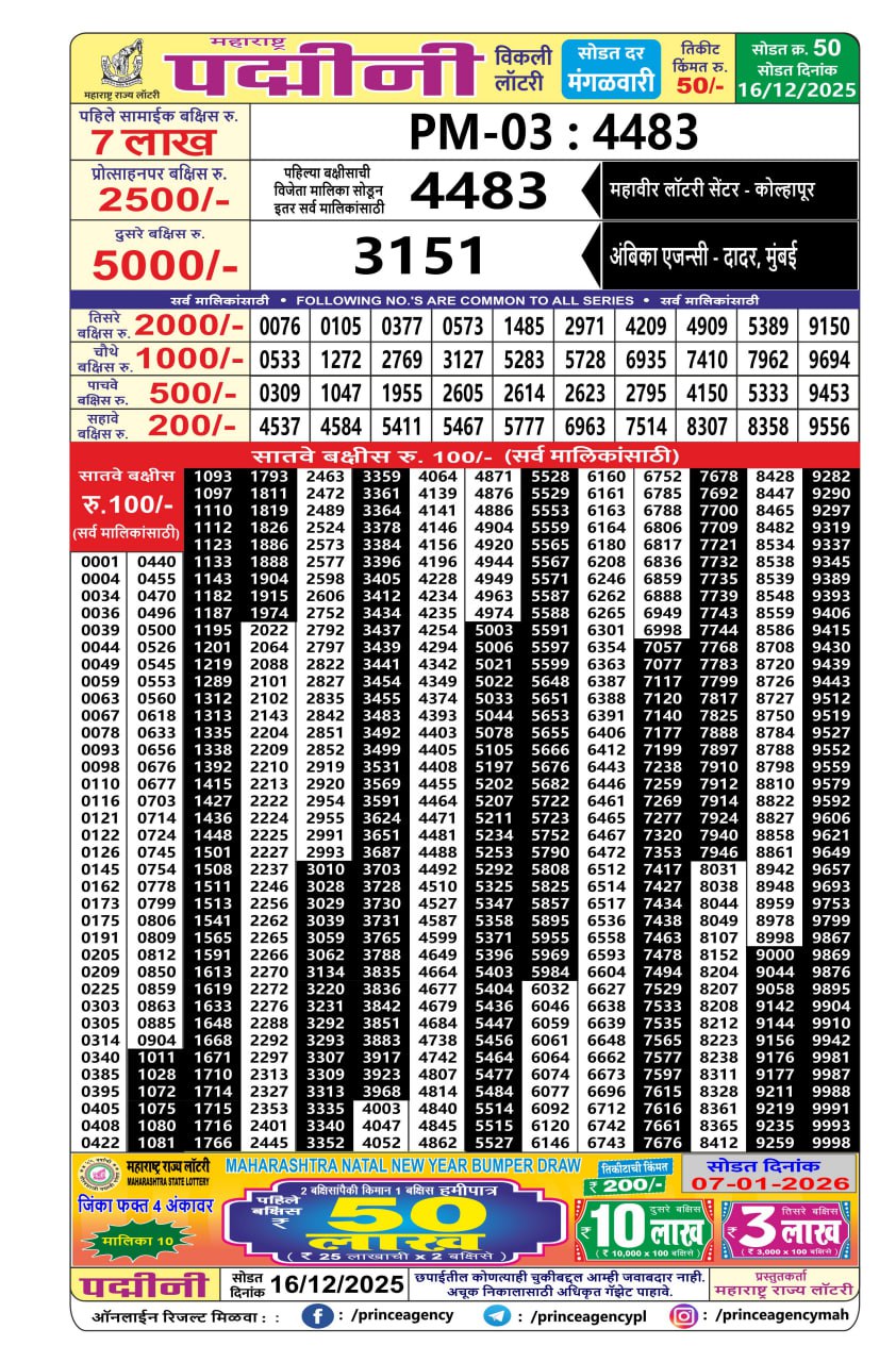 Maharashtra Padmini Weekly lottery result 16/12/25 16/12/25 Leave a Comment on Maharashtra Padmini Weekly lottery result 16/12/25 Share: XFacebookPinterestRedditVKDiggLinkedinMix Related Articles 0 125 Maharashtra Padmini weekly lottery result 25/11/25 1 175 Maharashtra Padmini weekly lottery result 14/10/25 0 155 Maharashtra Padmini weekly lottery result 02/09/25 0 5 Maharashtra Padmini Weekly lottery result 23/12/25